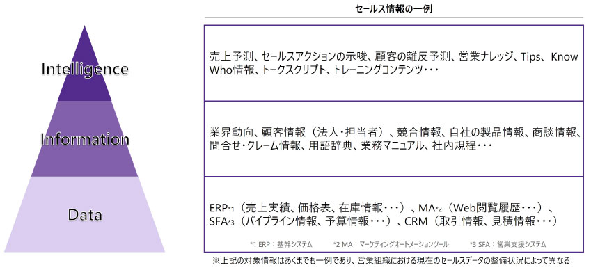当社が掲げる「データドリブンセールス」で取り扱うデータは、まず基幹システムで管理されている売り上げや在庫情報、案件情報や取引先情報等のいわゆる一般的な「Data層」の情報が挙げられる。そして市場動向や競合情報、商談情報や問い合わせ情報等、顧客との商談戦略を立てる際に重要となる「Information層」、さらには収集したデータから分析された予測値や分析結果から導出された示唆、顧客との商談で得たknow・Who情報等の「Intelligence層」までを対象としている(図2)。