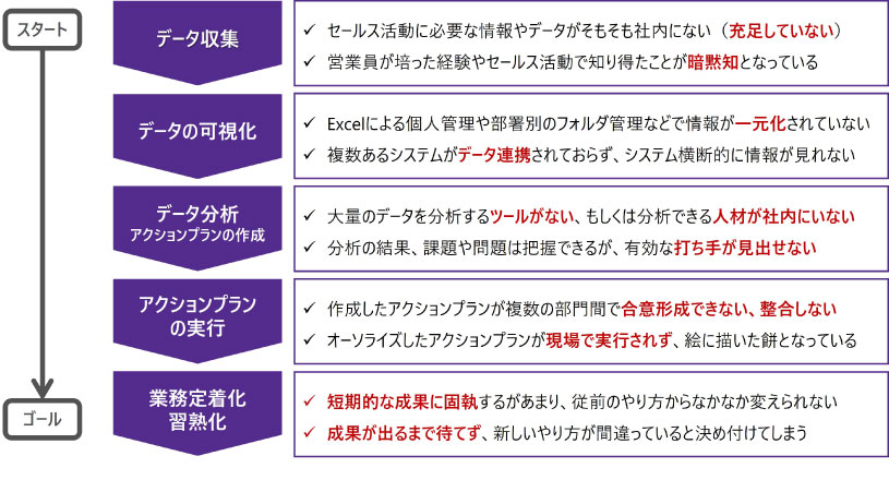 データドリブンセールスの実現・定着化に向けては多くのリソースと時間を要するが、だからこそ導入段階にてさまざまな問題が発生しがちになる。例えば、データドリブンセールスの肝である“データ”に関してはそもそも社内で保持されていないものや、各営業員の経験やセール活動で培ったTipsやKnow Who情報等の暗黙知を集めて可視化させるところから検討して仕組みを作れたとしても、分析するリソースの不足や、課題や問題に対する有効な打ち手を見出せないケースも多い。また、打ち手を基にアクションプランを作成しても、複数部門を跨ぐ際に整合しない・合意形成できないことや、上層部でオーソライズしても現場がすぐにアクションプランを実行してくれないこともある。短期的な成果に固執せず、時間をかけて一つ一つ現場に納得してもらいながら定着化・習熟化を行う必要があることを上層部・現場の双方が理解していないと、成果を待てずに、せっかく作った新しい仕組み(アクションプラン)が間違っていると決めつけられてしまう(図3)。