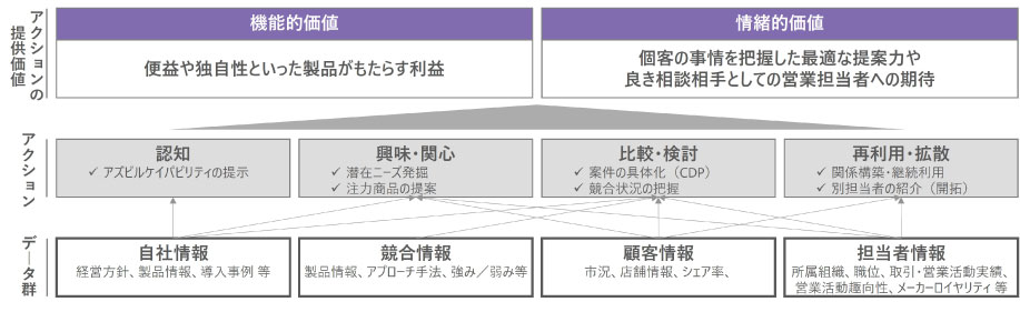 図4がデータを整理するための具体例だ。自社情報や競合情報といったセールスデータがどのアクションと紐づいているのかの関連性を表している。商談を成功させるために機能的価値を訴求するセールスデータは集まっていても、成功率を上げるもう一つの情緒的価値に関するデータが集まっておらず、データドリブンでの営業力強化施策として片手落ちになってしまっているケースが多く見受けられる。アクションを具体化し必要な情報を漏れなく可視化することで、データ起点に商談時の目的、およびアクションが明確になり、営業員による商談内容のバラつきを減らし、組織全体の営業力底上げにつながる。