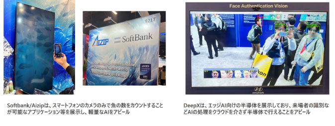 またDeepXは、エッジAI向けの半導体チップを展示し、識別などがエッジで十分に可能なレベルになっていることをアピールしていた。エッジAIはクラウドを介す必要がなくなるため、リアルタイムな制御が求められる自動運転やスマートファクトリーには必要不可欠な技術である。AIの軽量化・エッジは省電力化に繋がるため、サステナビリティの観点からも非常に重要な役割を担うと考えられる。