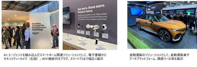 今年のCESでは、ビッグ・テック企業の展示ブースが限定的であったことも非常に印象的だった。特にGAFAMの存在感は非常に薄く、Amazon以外の企業はメイン会場に展示ブースを設けていなかった(Google傘下のWaymoは展示ブースを設けていたが、Googleブランドを全面に押し出したものではなかった)。唯一大々的に展示ブースを設けていたAmazonは、AIによる動体検知を組み込んだ防犯・見守り用のセキュリティカメラや生成AIによる絵画作成機能を持ったスマートテレビ、自動運転向けのデータ基盤や生成AI、IoTサービスを包括的に提供することで開発スピードを向上できるプラットフォームなど、幅広いソリューションの展示を行っていた。