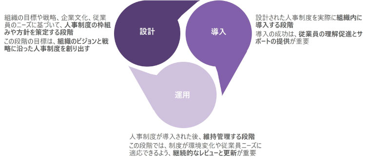 前述の通り人事制度は「設計」「導入」「運用」の3段階に分かれ、設計はその一段階に過ぎない。各段階が連携し、円滑なサイクルを構築することで、人事制度は効果的に機能する(図1)。