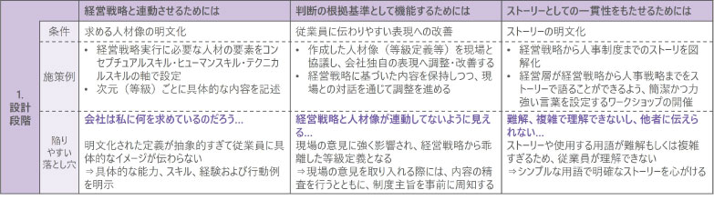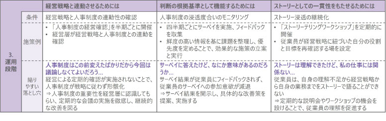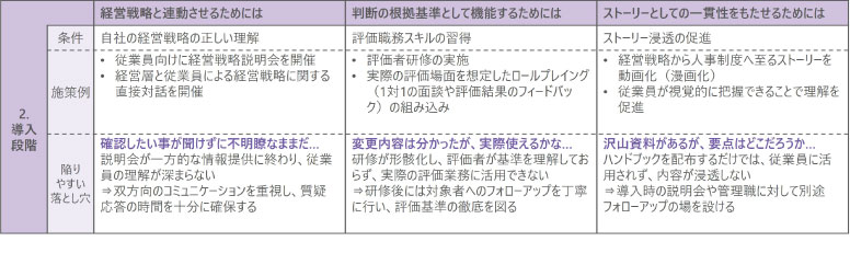 ここからは、「設計」「導入」「運用」の各段階において、3つの成功要件を満たすための「条件」「施策例」「陥りやすい落とし穴」について解説する。