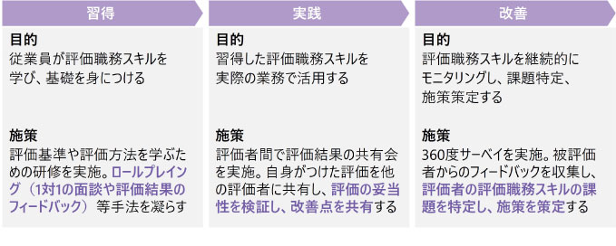 評価者が被評価者の職務を的確に評価するスキルを身につけることが求められる。