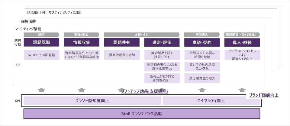 ➀でも触れた通り、BtoBブランディング活動の成果の見える化によって、社内に周知していくことができる。マーケティング活動や採用活動、サステナビリティ活動の情報開示などのIR活動などを通じ、良好なイメージが広がり認知度が高まれば(=ブランドイメージが向上すれば)競争優位につながり、ロイヤルティも高まっていくという支援機能としての貢献状況を共有できるのである。インナーブランディング活動の手段としては、社内ポータルへの掲載、社内報や社内SNSを通じた発信、社内研修やワークショップの開催など、さまざまな方法がある。BtoBメーカーにおいては社内でブランディング活動の必要性・重要性が十分に認知されていない可能性が推察されるため、認知を促し社内の機運をしっかりと高めていくことが重要である。