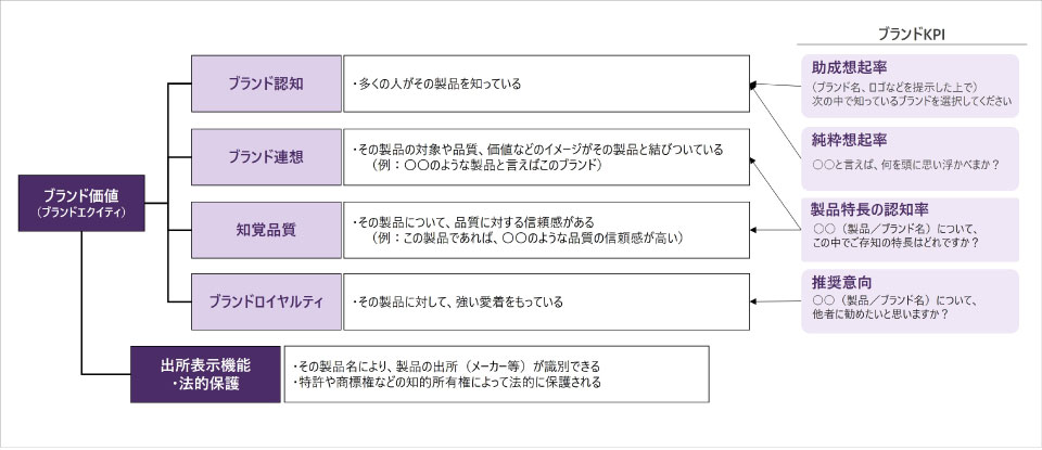 ブランドKPIは大きく「ブランド認知向上」と「ロイヤルティ向上」に大別することができる。ブランド認知向上に対しては「想起率」や「製品特長の認知率」といったKPIを捕捉し、ロイヤルティ向上に対しては「推奨意向」といったKPIを捕捉していくことが重要である。これらブランドKPIの効果測定を定期的に行い、成果を見える化することで社内周知が可能になる。ブランドKPIはブランド価値(ブランドエクイティ)を見える化するものであるが、「ブランド認知」や「ブランド連想」、「知覚品質」、「ブランドロイヤルティ」が高まることで、競争優位性やロイヤルティ向上に貢献している度合を把握できる。ちなみに、ブランド価値のもう一つの側面として、「出所表示機能」や「法的保護」にもつながることにも触れておきたい。ブランド価値が高まることで、人々の心に良好なブランドイメージが醸成され、類似製品や競合製品との差別化につながるのである。(図2)