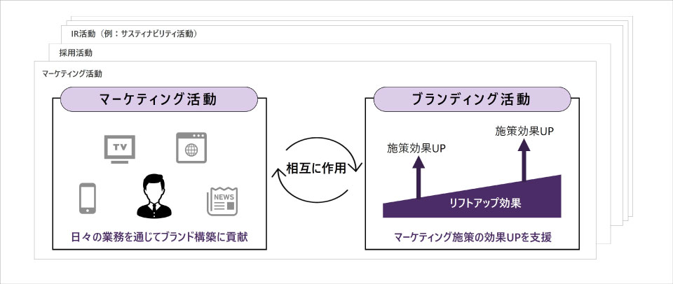 ブランディング部門がマーケティング部門の一部として組織的に位置づけられている場合、売り上げ貢献がミッションとして掲げられ、マーケティング活動とブランディング活動が混同されているケースがある。ブランディング活動は、企業や事業、商品・サービスの価値をステークホルダーに伝え、ブランド価値を築くための活動である。人々の心にブランドイメージを形成することで、競争優位性やロイヤルティ向上に貢献するが、直接的な売り上げ貢献は難しい。マーケティング活動や採用活動、サステナビリティ活動に関する情報開示などのIR活動といった企業活動において、良好なイメージが広がって認知度が高まれば競争優位につながり、ロイヤルティも高まっていく。ブランディング活動は企業におけるさまざまな活動の支援機能を担っているのである(図1)。