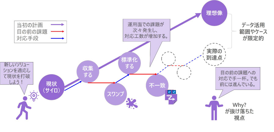 さらに、目の前の膨大なデータの処理に追われる事で、組織横断で実現したい事の検討がおざなりとなり、データ活用の範囲が自部門の業務効率化に留まってしまった。このように次から次に課題が現れ、気づけば全体像が見えなくなり、目的と手段の区別が曖昧になってしまうのが実情である。