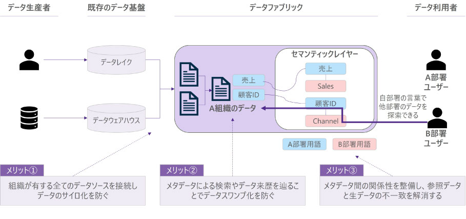 データファブリックはあらゆるデータを素早くつなぎ、統合された状態で“価値あるかどうか”を即座に検証できるアプローチとして注目されている概念である。データファブリックのアーキテクチャの中では各工場の製造履歴に「製造実績」、「製品シリーズ」など組織の用語をメタデータとして付与しデータの意味づけを行ったり、統合されたデータの来歴を辿ったりすることが可能になる。利用できるデータの範囲が拡大することで、サイロ化やデータスワンプに陥るリスクを軽減し、活用データを探す時間を大幅に短縮できる。