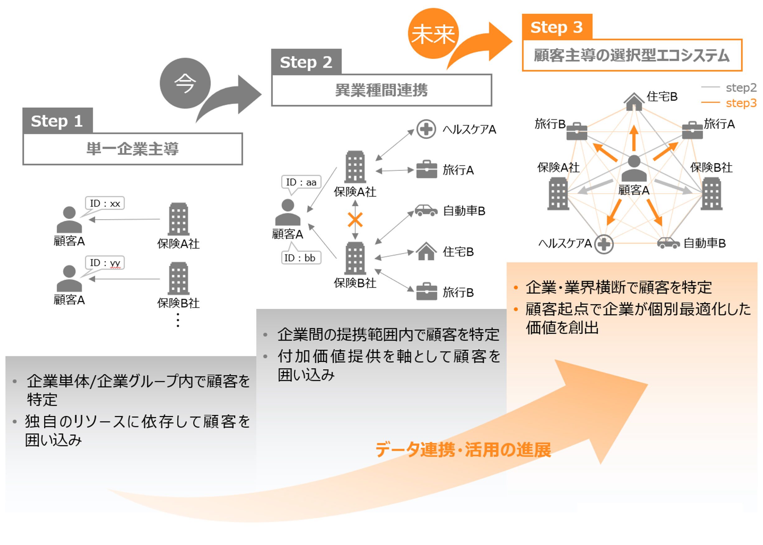 ここでポイントとなるのが、前節にある通り、顧客が自ら同意した範囲でのみデータ連携が行われるという点である。顧客自身が情報の開示をコントロールし、その情報をもとに企業はパーソナライズされた価値を提供する。企業が顧客を囲い込む従来型モデルとは異なり、顧客は多様な選択肢から最適なサービスを主体的に選べるようになり、結果として“顧客主導”のエコシステムが成立する。