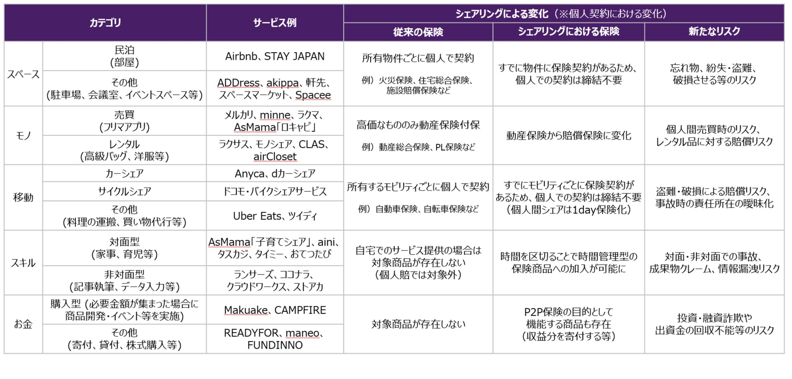こうした体験重視の消費行動への変化は、保険商品にも波及しつつある。所有物の所有期間中継続的に付保する長期契約型(1年契約の満期更新による契約を含む)から、旅行や趣味といった体験に合わせて契約する短期型やオンデマンド型の保険が普及してきている。シェアリングエコノミー協会の報告などでも、レジャーやイベントなど利用機会に合わせて保険を選択するケースが増加していると示唆されており、保険業界もこうした動向に対応した新商品開発が進められている。一方、SNS経由で他の利用者の評判を調べたり、スマートフォンで加入手続きを行ったりが当たり前となり、保険会社はより素早く柔軟に顧客ニーズに応えられる体制を整える必要に迫られている。