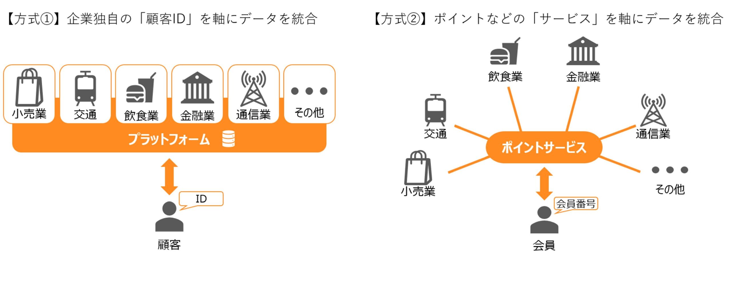 異業種間のデータ共同利用には、業界を横断する「横串」となる仕組みが欠かせない。その方式は、①企業独自の「顧客ID」を軸にデータを統合する方式、②ポイントなどの「サービス」を通じてデータを結びつける方式、の2種類に大別される。