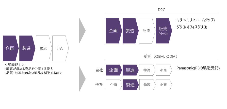 企画・製造に強みを持つ企業においては、「顧客ニーズを捉えた商品企画力」や「高品質かつ高効率な製品製造力」といった組織能力を活かし、消費者に対して自社が直接商品を販売するD2C(Direct to Consumer)モデルの事業展開が可能である。こうしたモデルは、消費者ニーズの把握や製品開発・製造のケイパビリティを十分に備えていないスタートアップ企業に対して、依然として優位性を確保しながら事業を展開できる点において、企画・製造アセットを有する企業にとって有力な戦略オプションである。