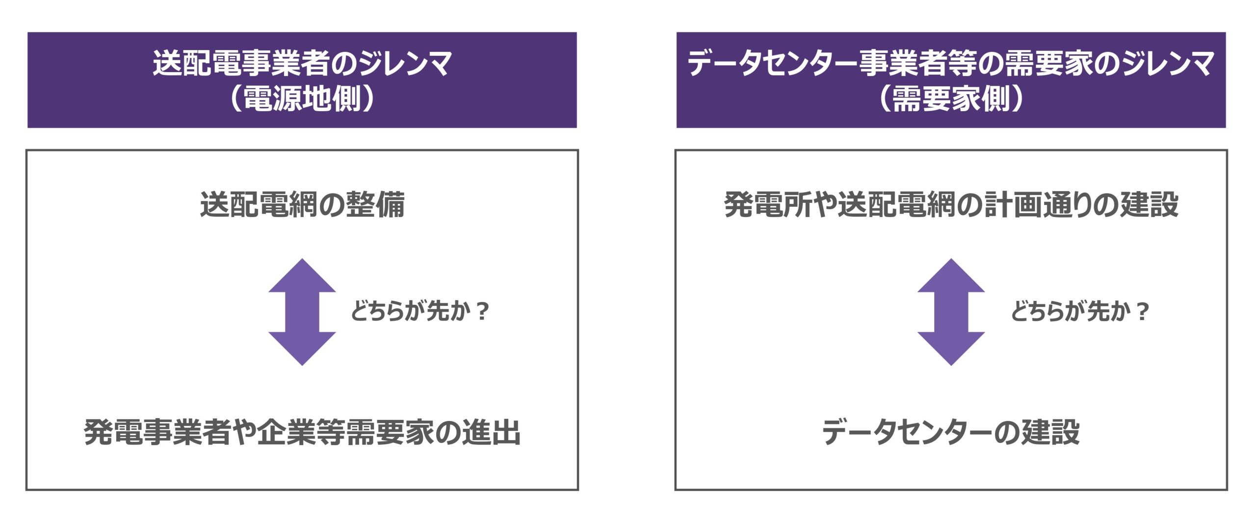 ここまでを整理すると、再エネ電源のポテンシャルエリアと、データセンターなどの需要家との間には、それぞれ図2のような、構造的なジレンマが生じていると言える。