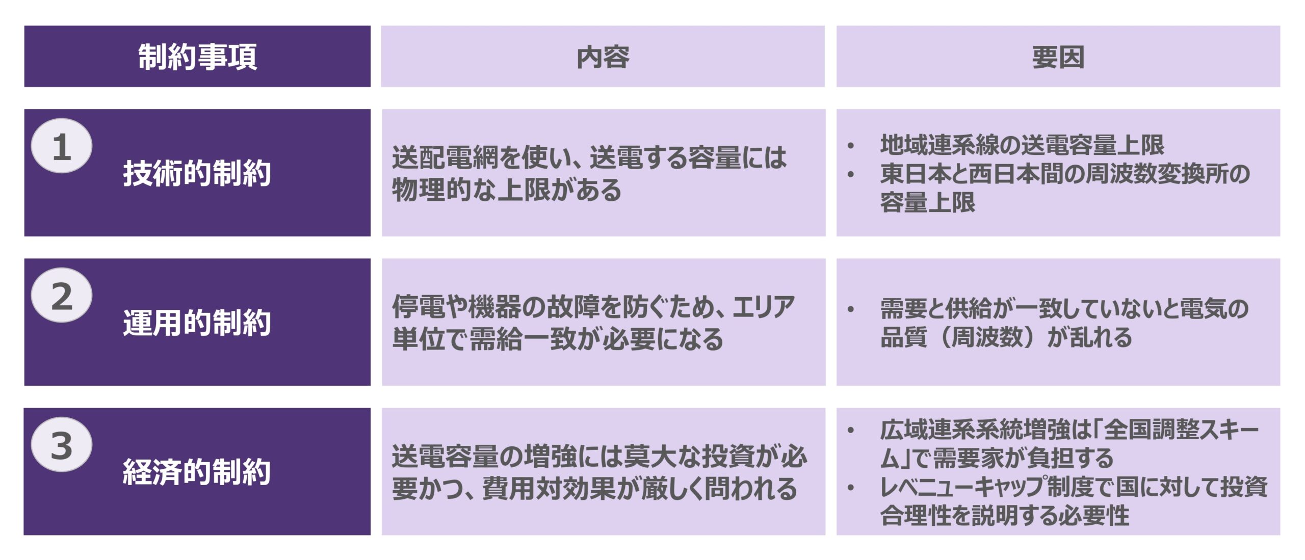 ①技術的制約:送配電網を使い、送電する容量には物理的な上限がある