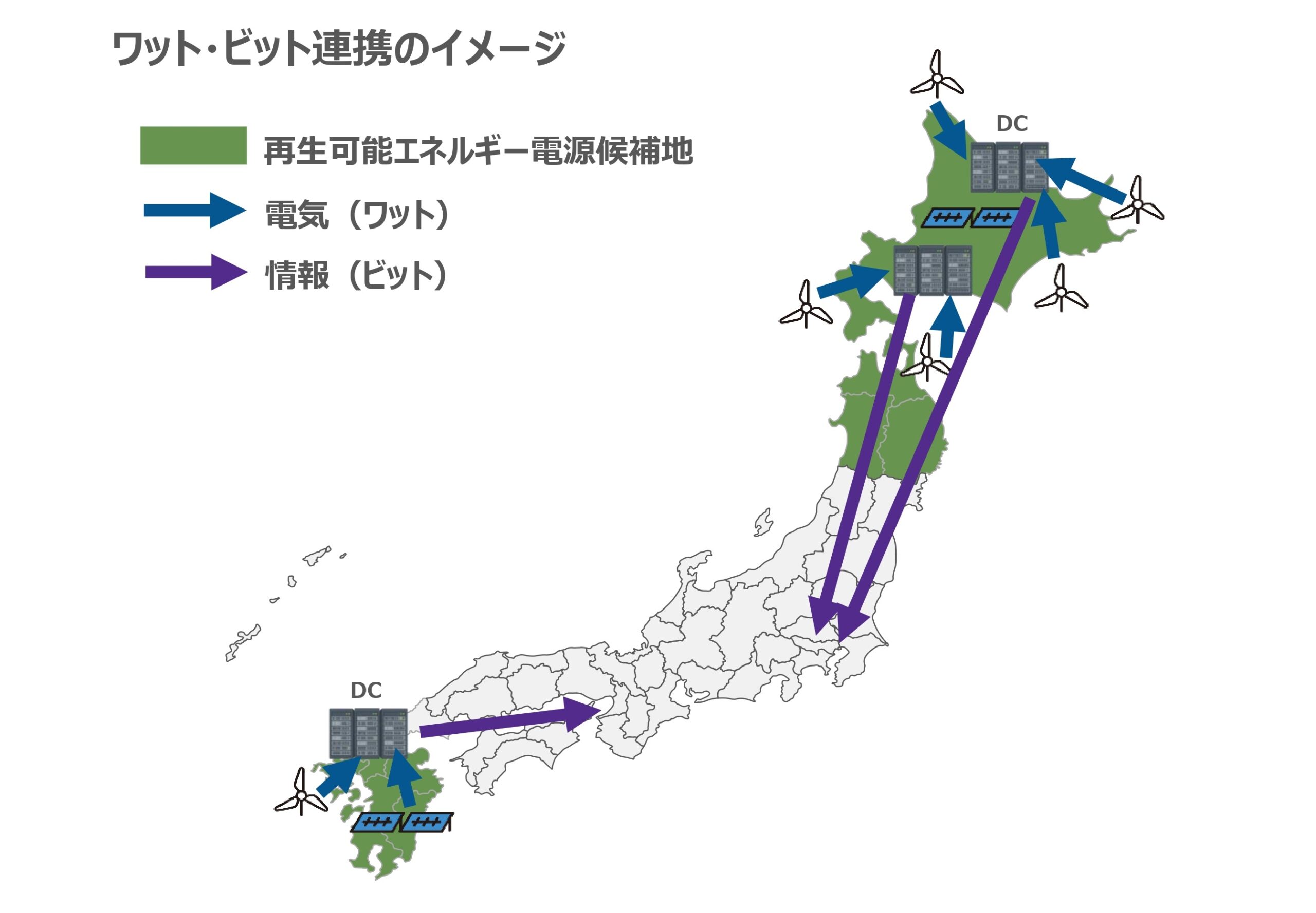 ワット・ビット連携とは、再生可能エネルギー発電施設とデータセンターなどの情報通信インフラを同一地域に一体的に整備することで、電力(ワット)と通信(ビット)を統合する新たなインフラ構想である。