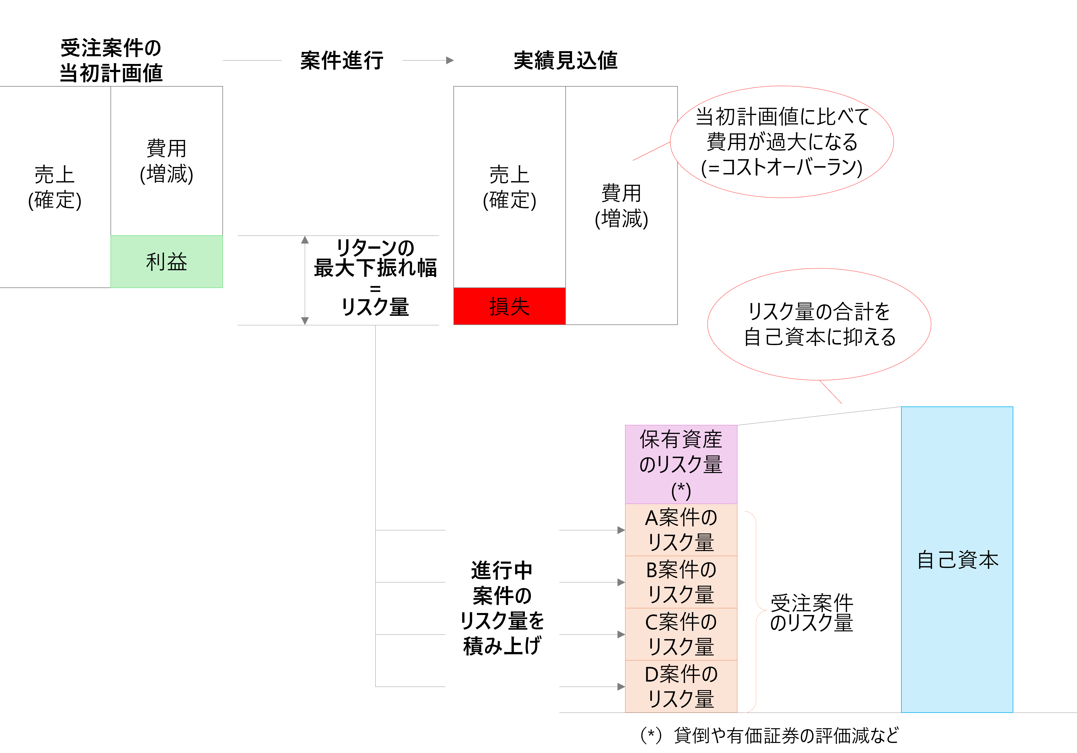 例えば請負契約で案件を受注する企業、特に建物の建設やシステム開発など一定の期間と規模のある案件を受注する企業は、受注判断時などに売上・費用・利益の計画数値を作成する。そのうち売上は契約によって決まるが、費用は内外の環境変化によって増大(コストオーバーラン)する可能性がある。それによって当初計画での利益数値がどれだけ下振れしうるか、その最大下振れ幅を受注案件のリスク量とし、保有資産のリスク量との合計を自己資本(*)に抑えるようコントロールする、という考え方を採っている企業がある。