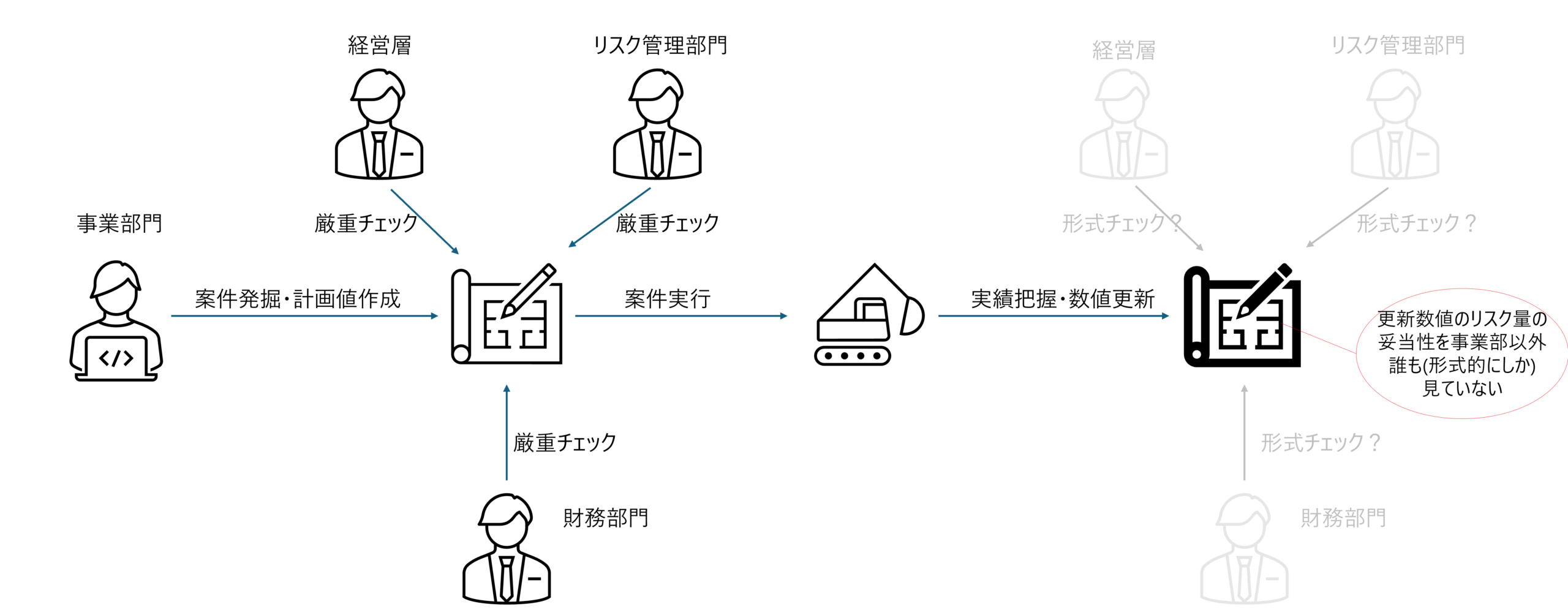 案件の受注判断時や資産取得時にはリスク要因の洗い出しや定量化が厳重に行われていても、時間の経過によるそれらの変動をモニタリングするまでには至っていない。あるいはモニタリングを行っていても、事業部が作成した数値をコーポレート部門が受領しそのまま経営層に報告されているだけで、客観的な立場から検証されない。こういった状況が生じる要因として、モニタリングのための工数不足が影響していると考える。同時進行している複数の案件について、継続的に必要データのモニタリングを行い精度のある検証を定期的に行うには相当な工数が必要になる。