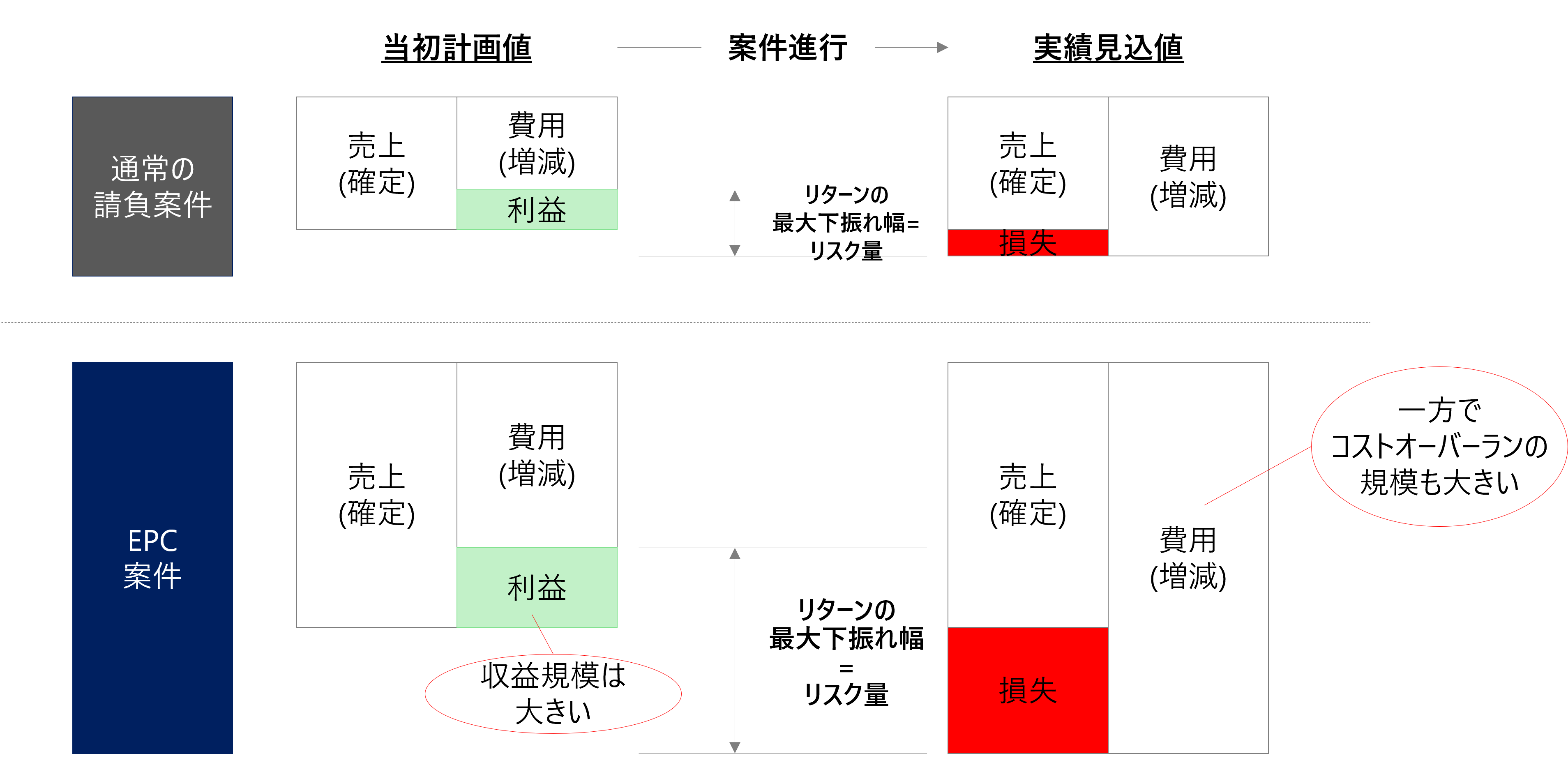 例えばEPC契約によって案件を受注・請負う場合がそうではないだろうか。EPC契約とは、設計(Engineering)、調達(Procurement)、建設(Construction)の全ての工程をまとめて請負う契約であり、プラント建設や鉄道敷設といった長期大型工事の受発注の際に取り交わされることが多い。この契約形態で請負う案件(=EPC案件)の特徴として、全工程を一括で請負うことから計画通りに進めば大きな売上や利益を見込める一方で、コストオーバーランが発生した場合の規模も大きく、リターンの最大下振れ幅、すなわちリスク量も非常に大きいという点が挙げられる。