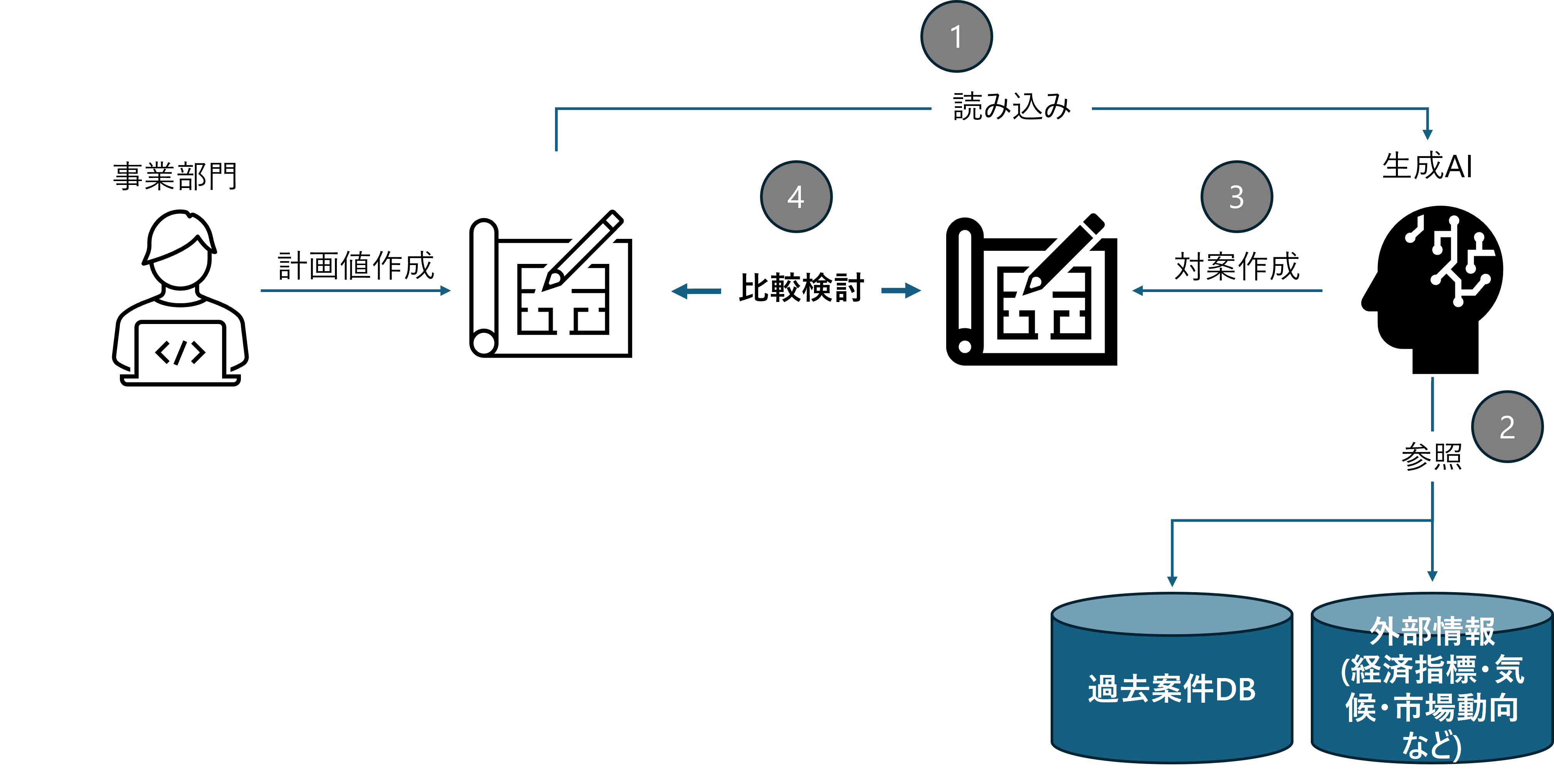 二つ目は、事業部が作成した計画値・着地見込み値とは別に、生成AIによって対案を作り両者を比較することで検証する方法だ。手順は大まかに以下のような流れになる。