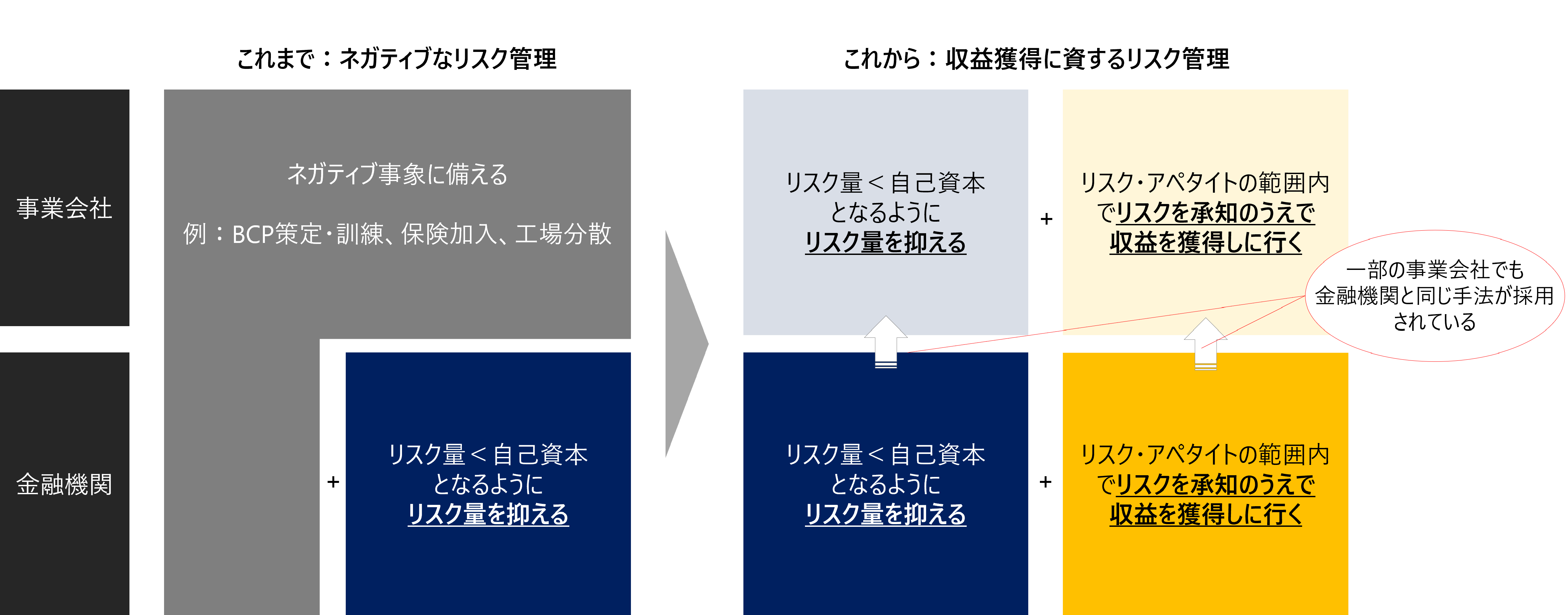 このように昨今のリスク管理は、かつてのようなネガティブな事象に対応するものだけではなくなり、将来の収益獲得と密接に関連したポジティブなテーマにも対応するようになってきた。