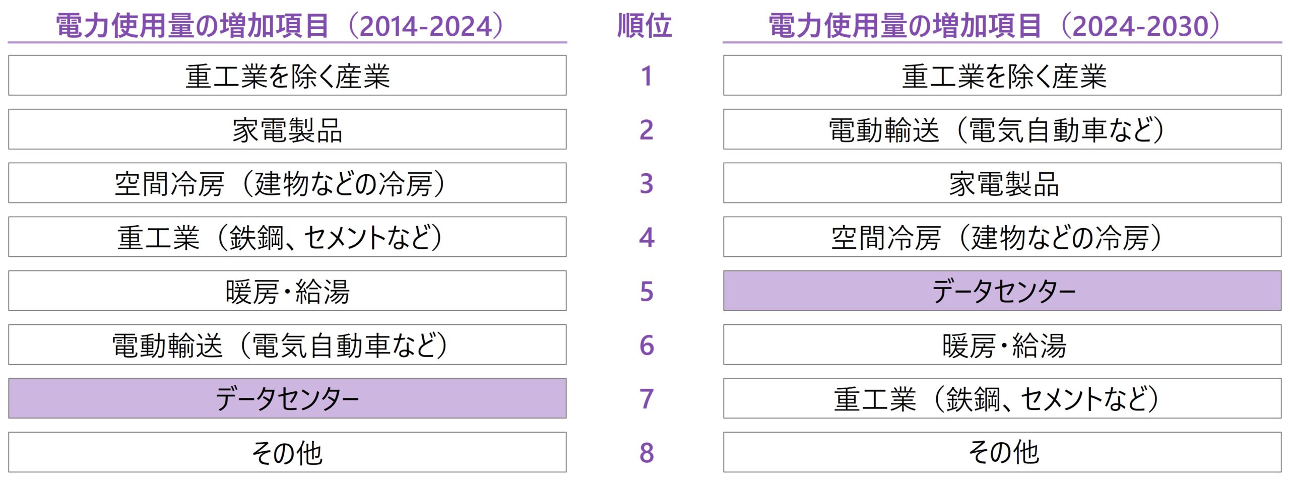 国際エネルギー機関(IEA)の『World Energy Outlook 2024』によれば、世界の電力需要は2023年から2035年にかけて年率約3%で増加すると予測されている。この増加の主要因の一つとして、データセンター需要の拡大が挙げられている[2]。同書によれば、2024年から2030年にかけての部門別電力使用量増加要因として、データセンターは第5位になると予測されている。これは前期間(2014-2024年)の第7位から大きく順位を上げており、AI技術の普及等のデジタル技術の急速な成長を反映している(表2)。