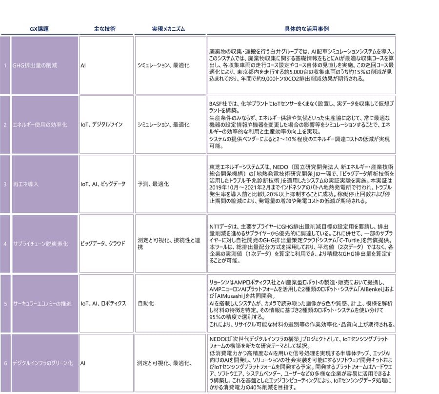 複雑に絡み合うGXの課題に光をもたらすのが、革新的なデジタル技術である。測定・可視化、最適化、新たなビジネスモデルの創出まで、デジタル技術は単なるツールではなくGX実現の架け橋として企業変革を支えている。例えば、IoTとAIを活用した高度なエネルギー需要予測やサプライチェーン全体のGHG排出量算定・管理を実現するためのデジタルプラットフォーム、ロボティクスによる効率的な物理オペレーション、デジタルツインによる効果的な生産プロセス改善や省エネ設備への更新などさまざまなことが考えられる。GX課題解消に向けた、各デジタル技術の活用例を表 3に示した。