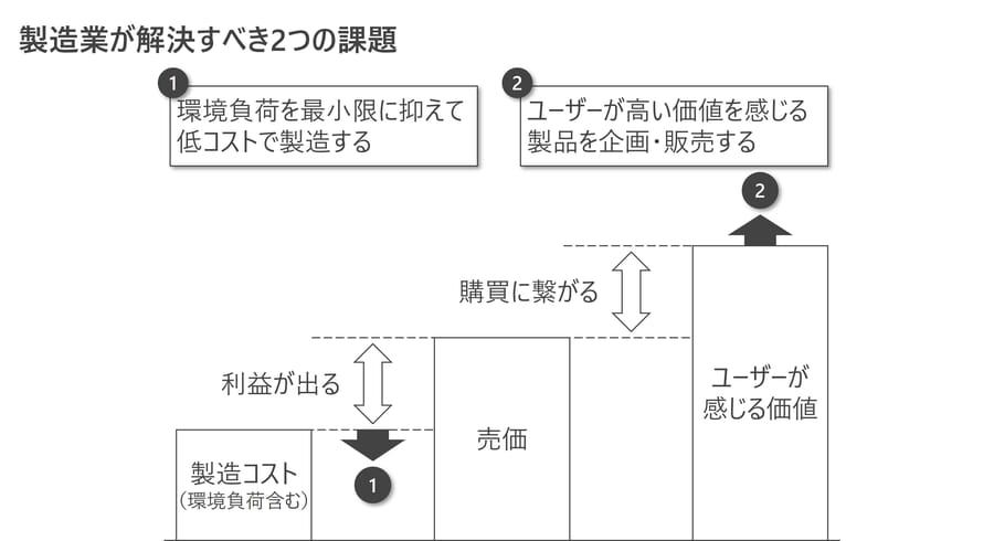 現在の製造業では、環境への配慮で求められる水準が高まっている。加えて製品のコモディティー化が進む中でも付加価値を提供するため、多様なニーズへの対応が求められる。この状況下で製造業の企業が生き残るためには①環境負荷を最小限に抑えて低コストで製造する②ユーザーが高い価値を感じる製品を企画・販売するという二つの課題を継続的にクリアしていかなければならない。