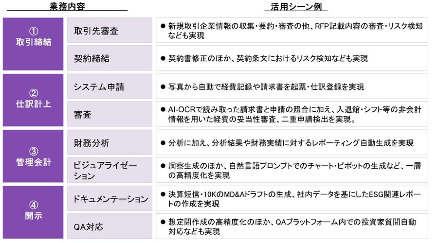 生成AIが登場するまでの経理・財務部門におけるAI活用といえば、AI-OCRによる請求書読み取りなどが主流であり、文章生成や対話といった生成AI特有の能力を業務にどう活かすかは手探りの段階であった。こうした状況では、既存の業務構造や過去の常識にとらわれず、活用シナリオを構想するための視点を切り替える必要があった。