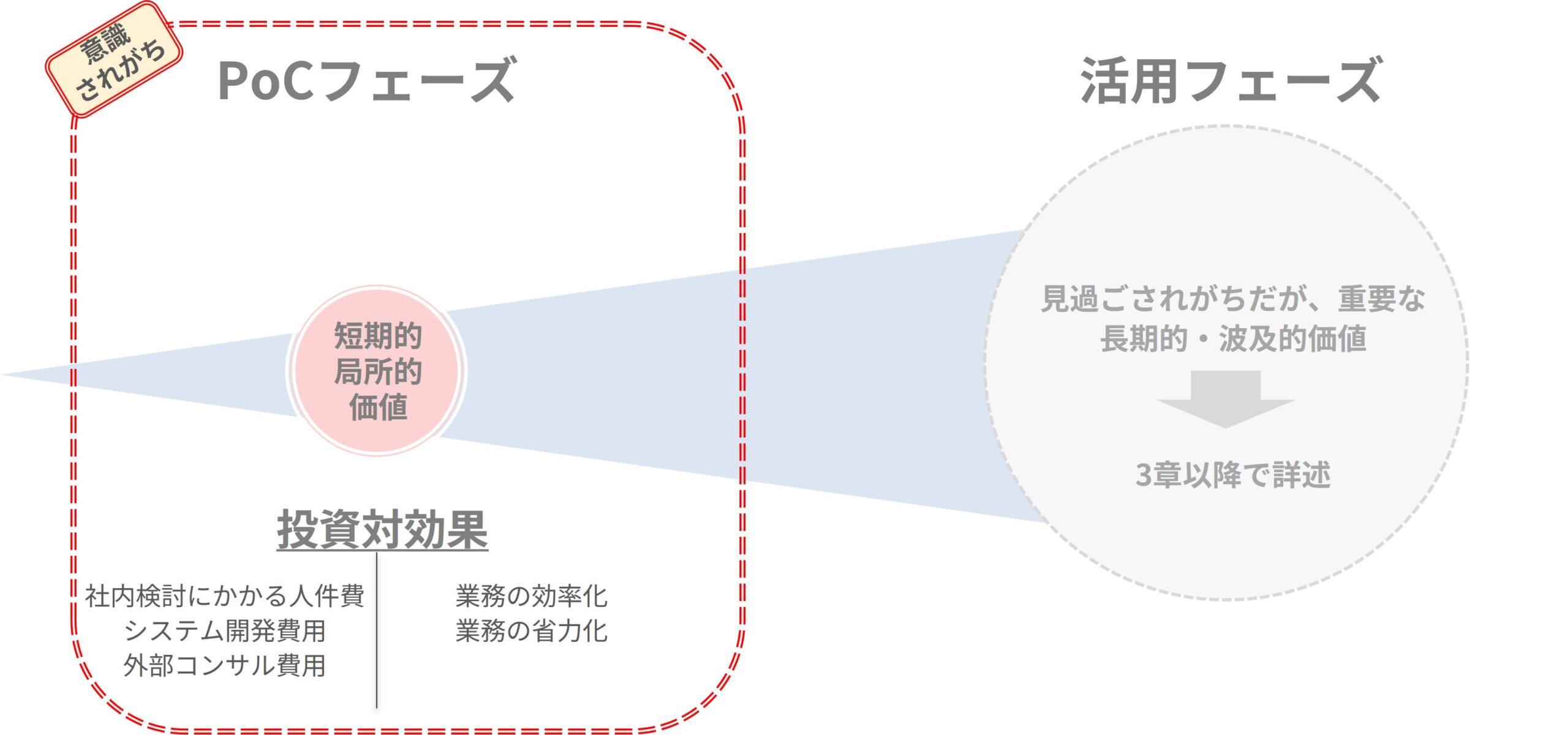 PoCフェーズで多くの企業が効果測定に苦慮している背景には、評価構造のいびつさがある。PoCフェーズでは社内検討にかかる人件費、システムの初期導入費用、外部パートナーへの支援費用などのコストが発生する。一方で、PoCフェーズでの効果は省力化や効率化といった、短期的かつ局所的な成果のみを捉えがちである。