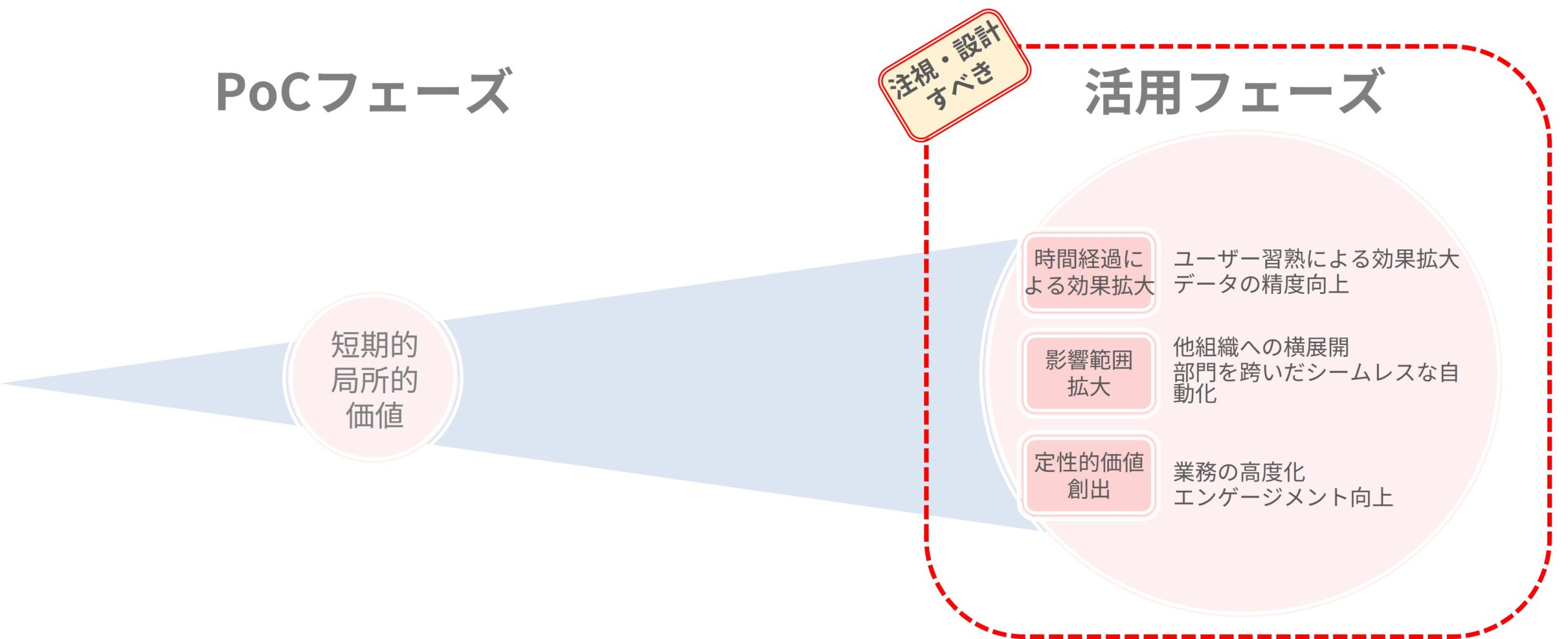 PoCフェーズのROI評価は、特定部門や業務に限定されがちだが、生成AIは汎用的かつ柔軟性の高い技術であり、業務や部門をまたいだ展開によって、全社的な価値創出へと波及しやすい特性を持つ。このため、初期導入範囲の成果だけに基づいた評価では、活用フェーズにおける価値の全体像を捉えきれない。