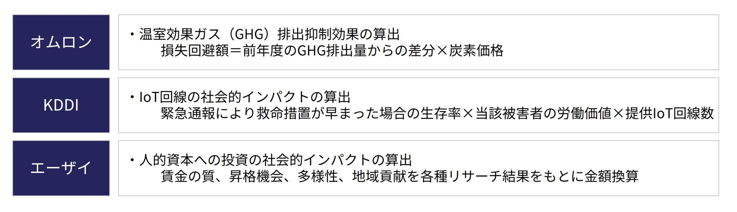 - 出典:オムロン株式会社『統合レポート2024』、KDDI株式会社『サステナビリティ統合レポート2024』、エーザイ株式会社『価値創造レポート2024』よりフォーティエンスコンサルティング作成