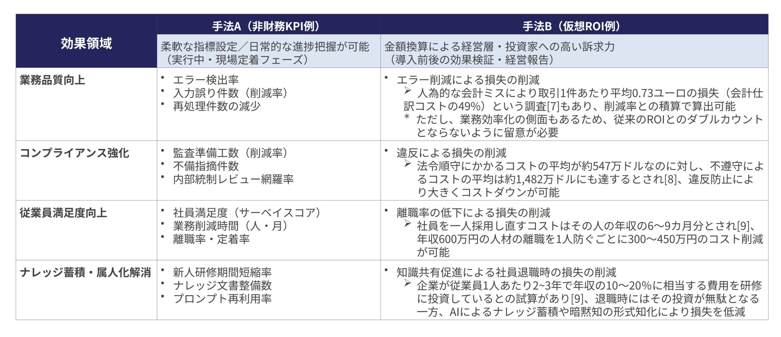 上述の通り、生成AIの導入においては、「投資対効果」がより強く求められる活用フェーズに入っている。しかし、生成AIのような汎用性・拡張性の高い技術では、業務の質的変化や波及的価値が大きく、従来のROI指標だけではその実態を捉えきれない場合がある。したがって、時間軸や影響範囲を広く捉えたROI算出に加え、金額換算にこだわらず、非財務KPIを通じて可視化した定量・定性両面の効果を組み合わせて評価する視点が欠かせない。これにより、投資判断・進捗管理・最終効果検証の各段階でより実践的な意思決定が可能になる。