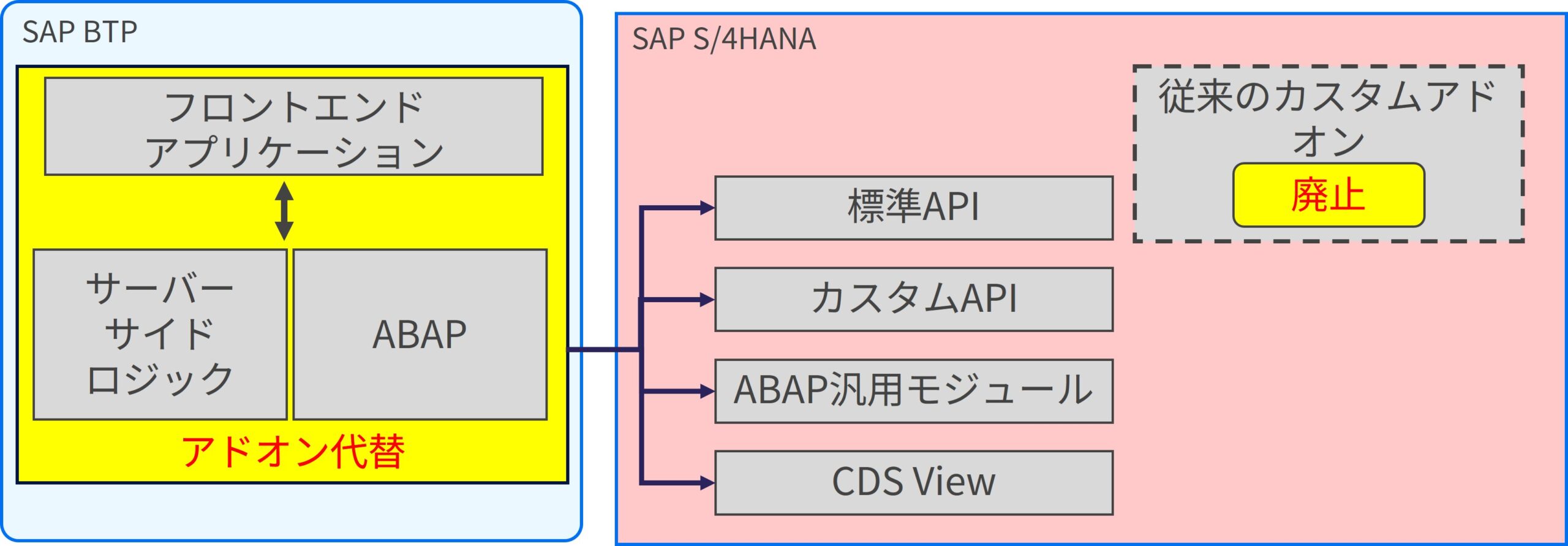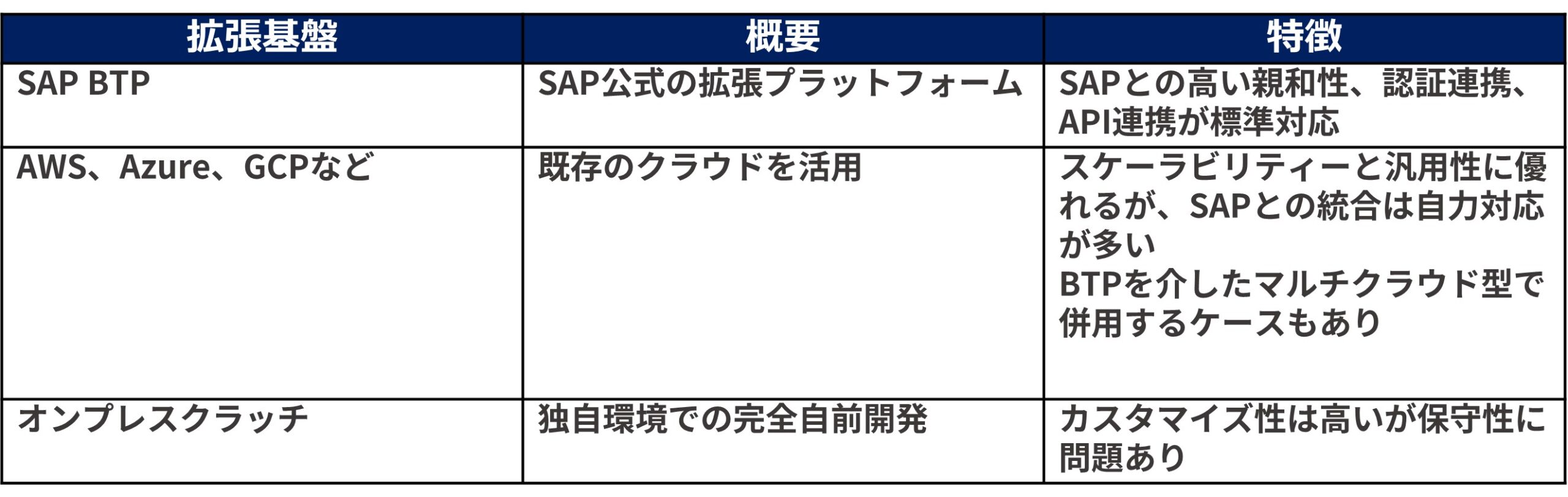 オンプレミス型(プライベートクラウド型)/パブリッククラウド型のいずれの選択肢においても共通するのは、「標準機能で対応できない部分をどう補完するか」 という課題だ。この補完領域を担うのがSAP BTPである。