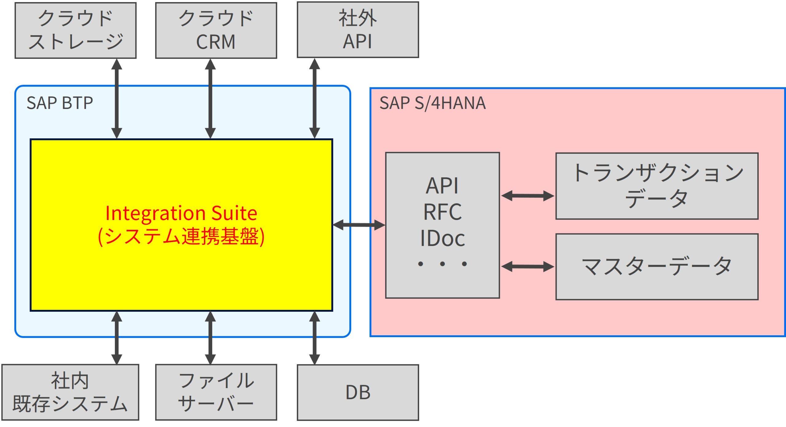 SAP Integration Suiteを中心としたBTPサービスを用いることで、S/4HANAと周辺システム(SAP製品、非SAP製品、クラウドサービス)の一元的な連携が可能になる。従来のようにシステムごとに個別開発・運用していたインターフェースを集約し、保守コストを削減できる。加えて、今後のシステム刷新やM&Aなどで新たなシステムが追加された際にも柔軟な対応が可能だ。