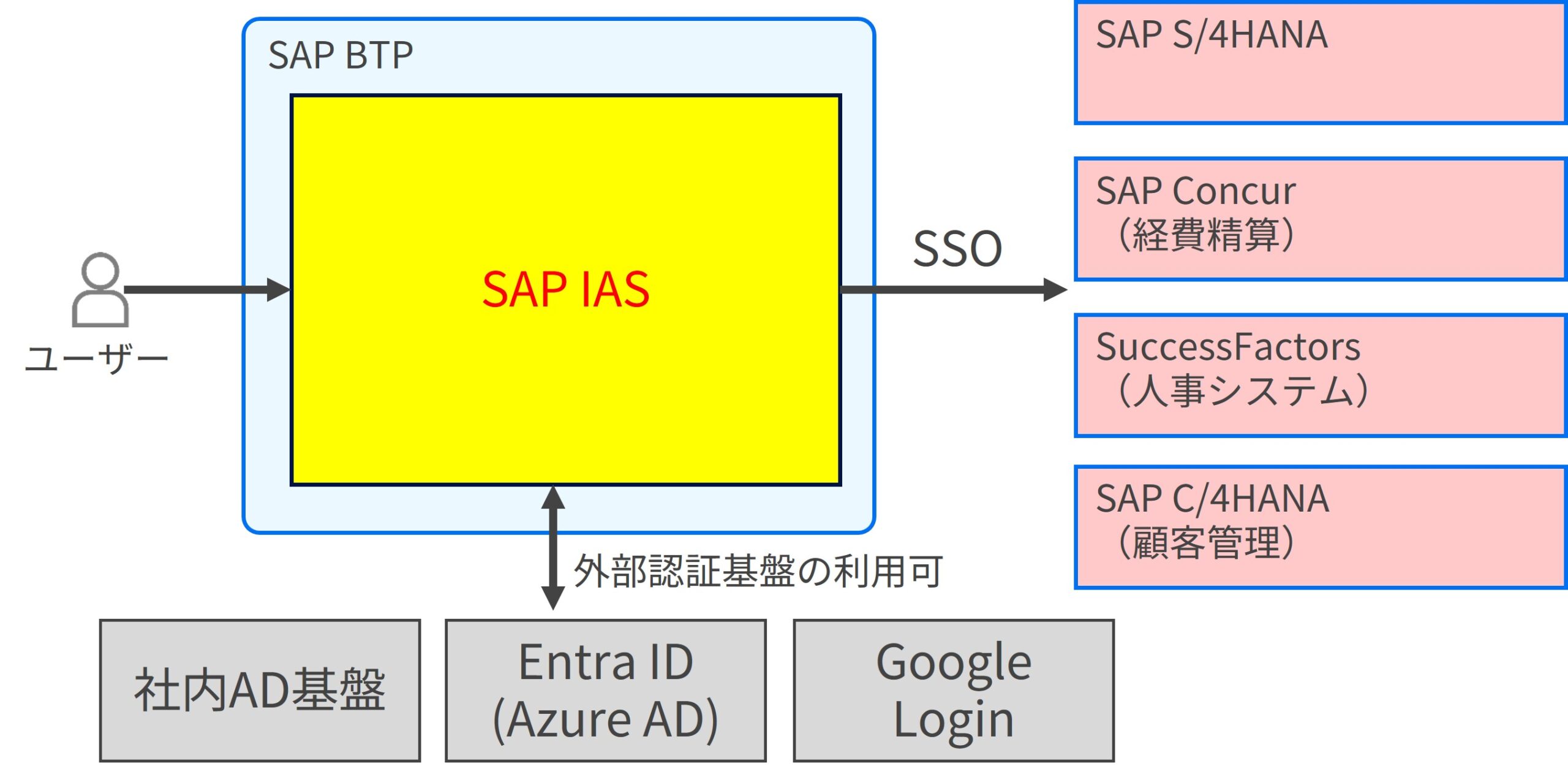 この課題に対しては、SAP Identity Authentication(IAS)/Identity Provisioning(IPS)を中心としたID基盤をBTP上に構築することで、クラウド間SSOと認可管理を標準化できる。また、Microsoft Entra IDなどのAD基盤との連携も可能だ。