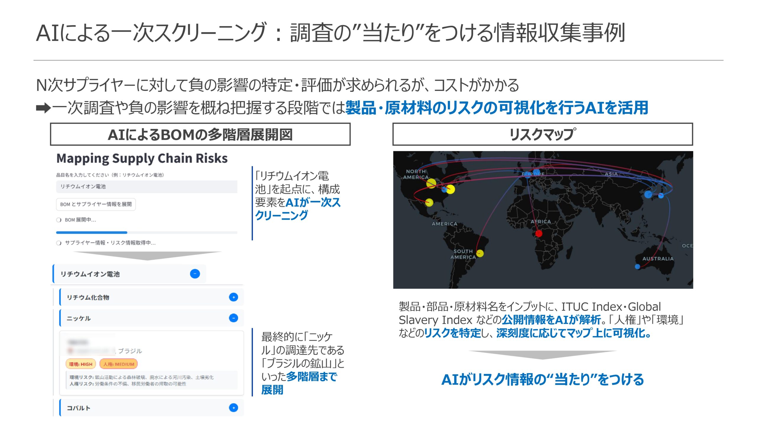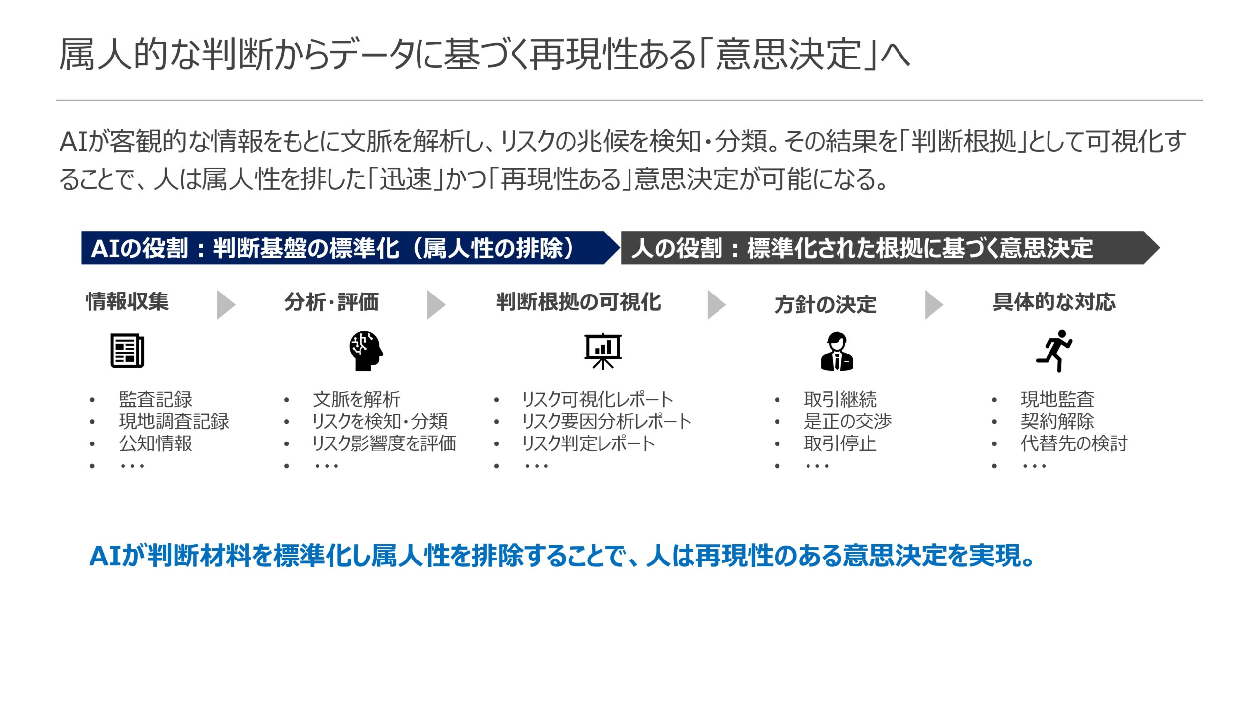 例えば、「コンプライアンス・オフィサーとして、人権侵害リスクが報道されたサプライヤーを即座に特定したい。なぜなら、迅速な調査開始が必要だからだ」といった具体的なユーザーストーリーを定義する。その問いに対し、AIが膨大な情報から客観的な判断材料を抽出し、誰もが理解できる形で提示する。これにより、担当者は、かつて一部のベテランの経験と勘に頼っていた判断を、標準化された客観的データに基づいて行えるようになる。AIが判断材料を標準化し、人は最終的な意思決定に集中する。この設計思想を応用することで、リスク検知時に「取引を継続するか、是正を交渉するか、停止するか」といった重要な経営判断を、客観的データに基づき「迅速」かつ「再現的」に行うことが可能になる。