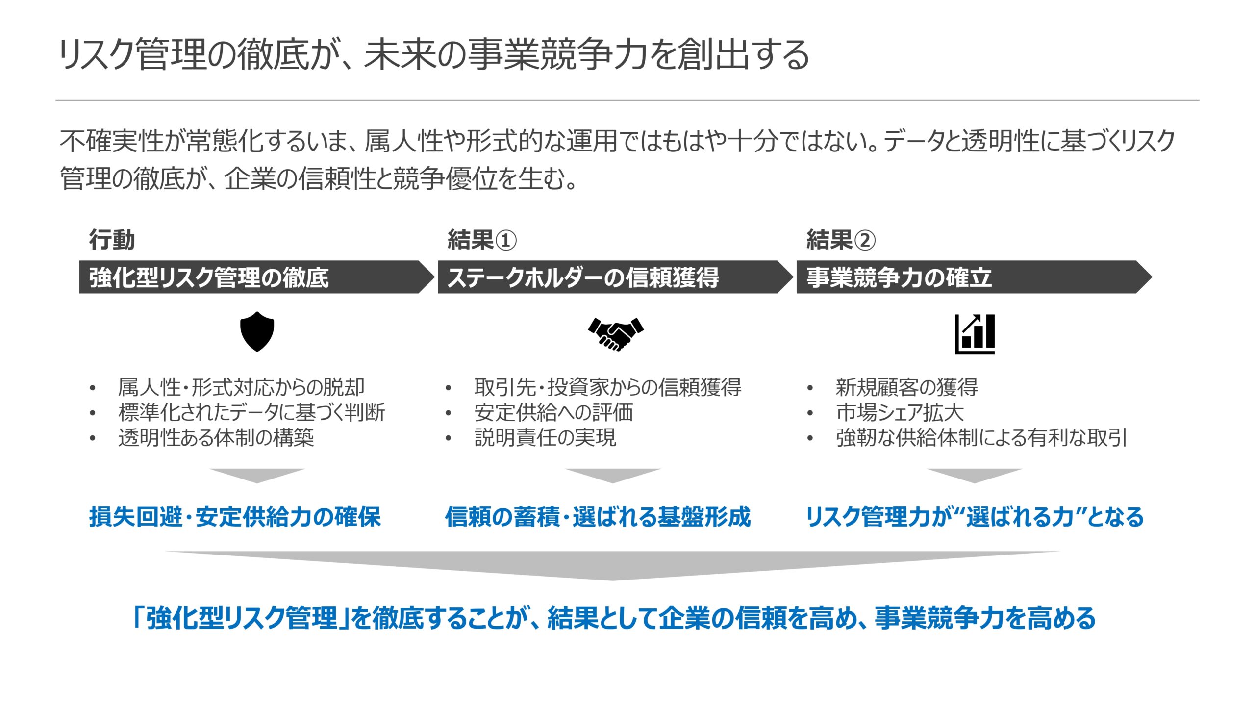 本稿が提言する「再現性のあるリスク管理体制」を構築し、それを顧客や市場に対して明確に実証すること。それ自体が、競合他社に対する強力な差別化要因となり、不確実性の時代において「選ばれる」ための決定的な武器となる。これは、新たな顧客獲得や有利なパートナーシップに直結し、まさしく企業の売上拡大に貢献する「事業競争力」そのものである。