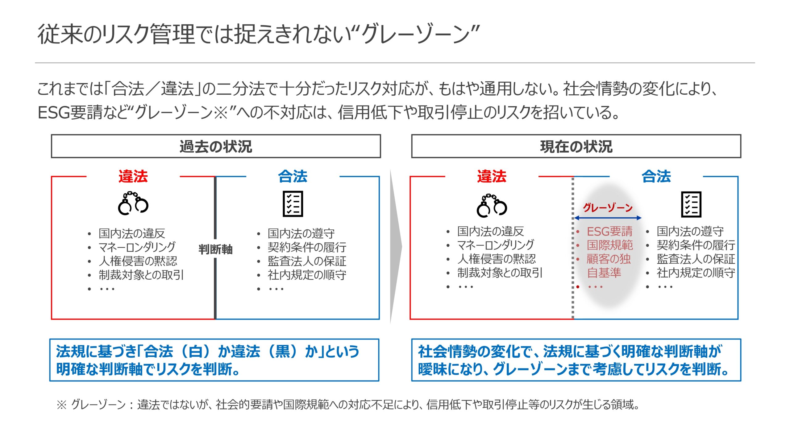そして、この構造的な脆弱性が、ある日突然、予期せぬ形で経営リスクとして顕在化する。それが「グレーゾーンリスク」だ。従来のコンプライアンスが問うのは「この行為は国内法で合法か」という点であった。しかし、グレーゾーンリスクが問うのは、「この取引は自社のESG理念や社会の要請と整合するか」「欧米の主要顧客や投資家はどう評価するか」といった、より複雑な問いである。こうした未来志向かつステークホルダー中心の問いを怠ることが、企業を予期せぬ危機に晒す。