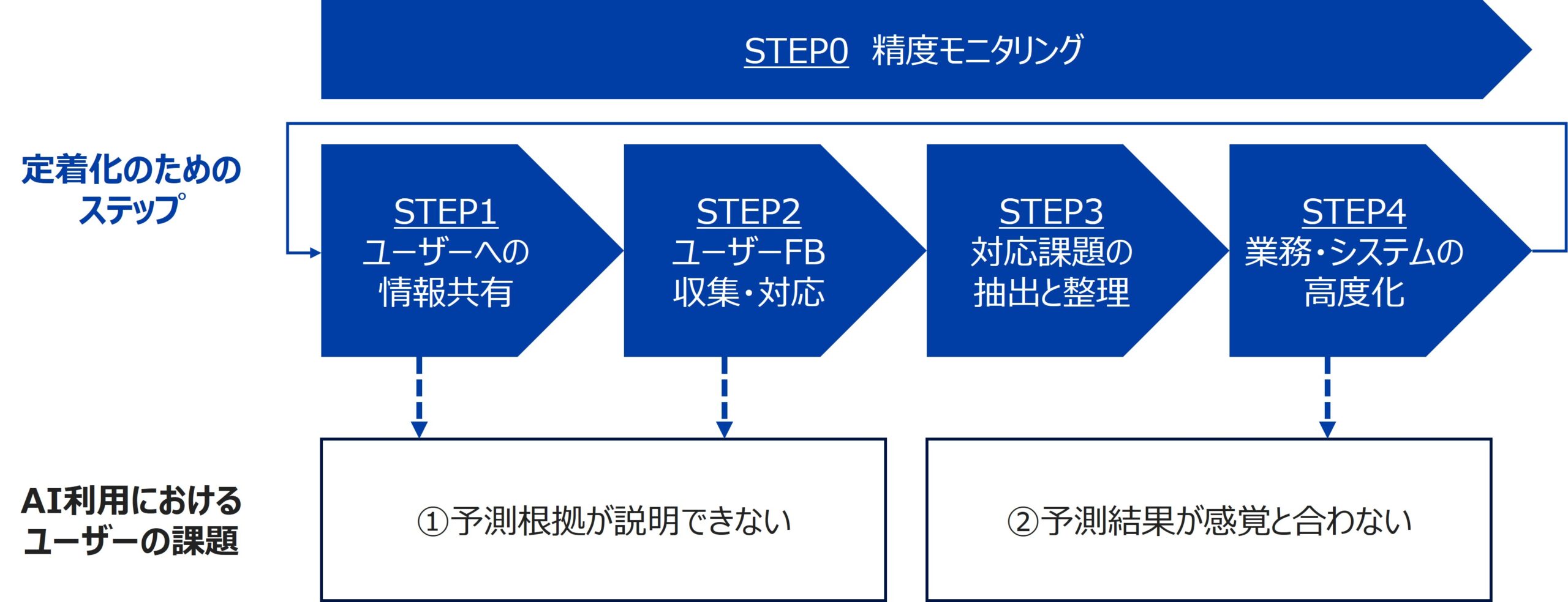 AIシステムの高度化や改善を行った後には、STEP1に戻り、必ず業務ユーザー向けの説明会やトレーニングを実施することが重要である。「どの課題がどのように解決されたのか」「得意分野や活用推奨範囲がどう変わったのか」を漏れなくアップデートすることで、活用度を高められる。また、繰り返し説明会やトレーニングを実施することで、業務ユーザーのAIに対する理解度と信頼感も高まっていく。