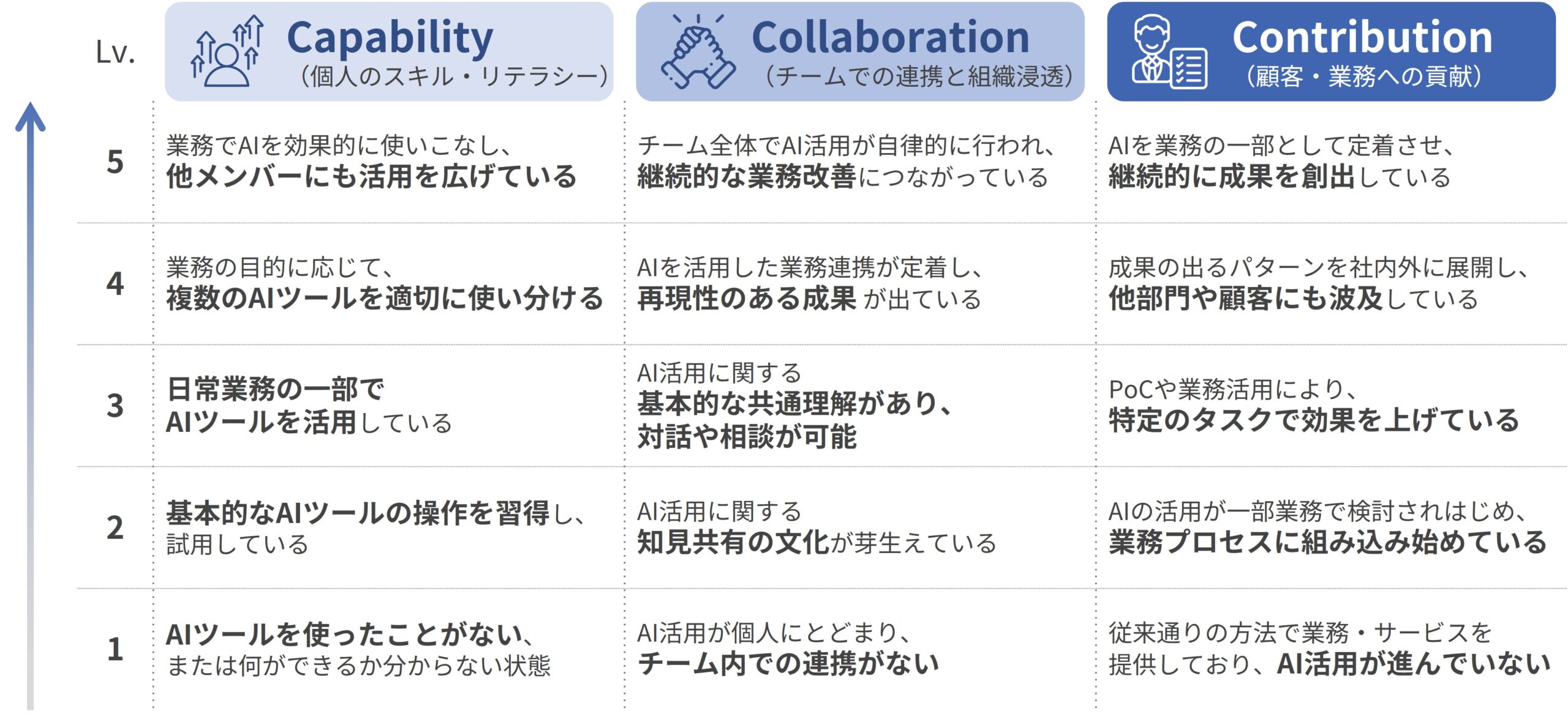 そこで本マトリクスでは、個人のスキル基盤(Capability)に加え、属人化を防ぎ組織として学習を蓄積するための協働・共有の度合い(Collaboration)、さらに業務成果や顧客価値への貢献(Contribution)という3つの観点を評価軸として設定している。この3Cを組み合わせることで、単なる利用状況の把握にとどまらず、変化の激しい生成AIに対して継続的にどう向き合い、どれだけ組織として価値創出につなげているかを多面的・動的に評価できるようにしている。