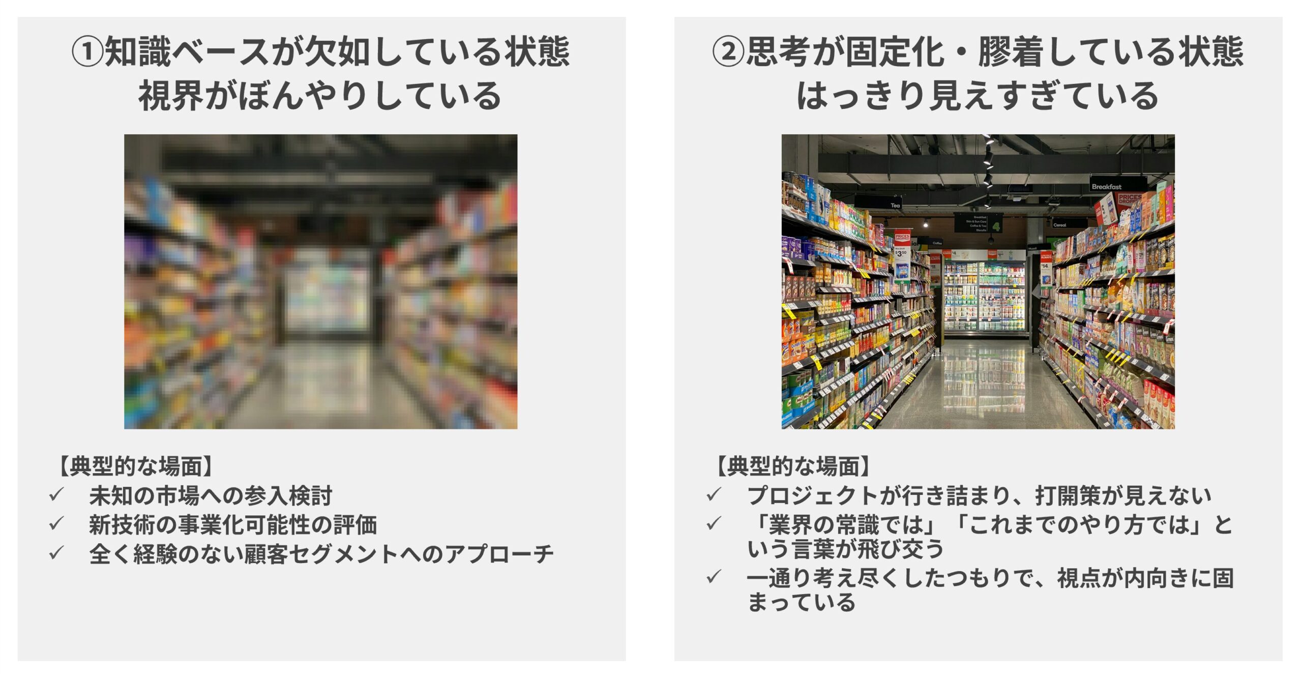 この「ソクラテス式AI」は、特にビジネスにおいて図2にあるような、①知識ベースが欠如している状態、もしくは②思考が固定化・膠着している状態で真価を発揮する。