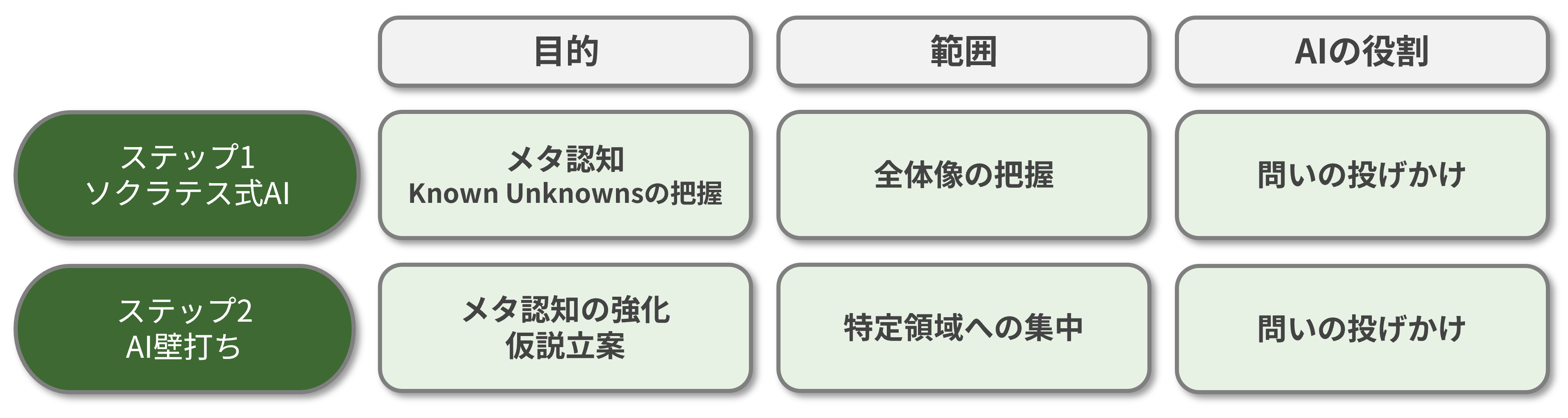 ステップ1の「ソクラテス式AI」が、「何を知らないか」を全体的に把握するプロセスであったのに対し、ステップ2の「AI壁打ち」は、特定の領域にフォーカスを絞り、メタ認知を強化し、仮説を立てるプロセスである。図4に示すように、AIの役割は問いの投げかけという点では変わらないが、その目的と対話の範囲が異なる。