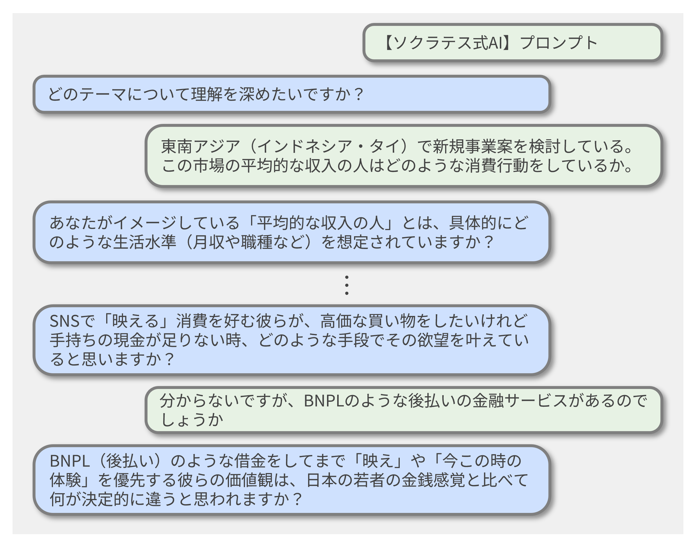 実際の「ソクラテス式AI」のやりとりのイメージは以下の通り。AIが常に中立的な立場で質問を繰り返す。例えば、現地のターゲット顧客の消費行動について、「映える消費」という一般的な回答から、一歩踏み込んで「その場合にどのようにお金を工面しているか」という点まで問われることで、その点も考慮に入れる必要があることに気づかされる。このようなやりとりを繰り返しながら、無知を自覚していくのである。