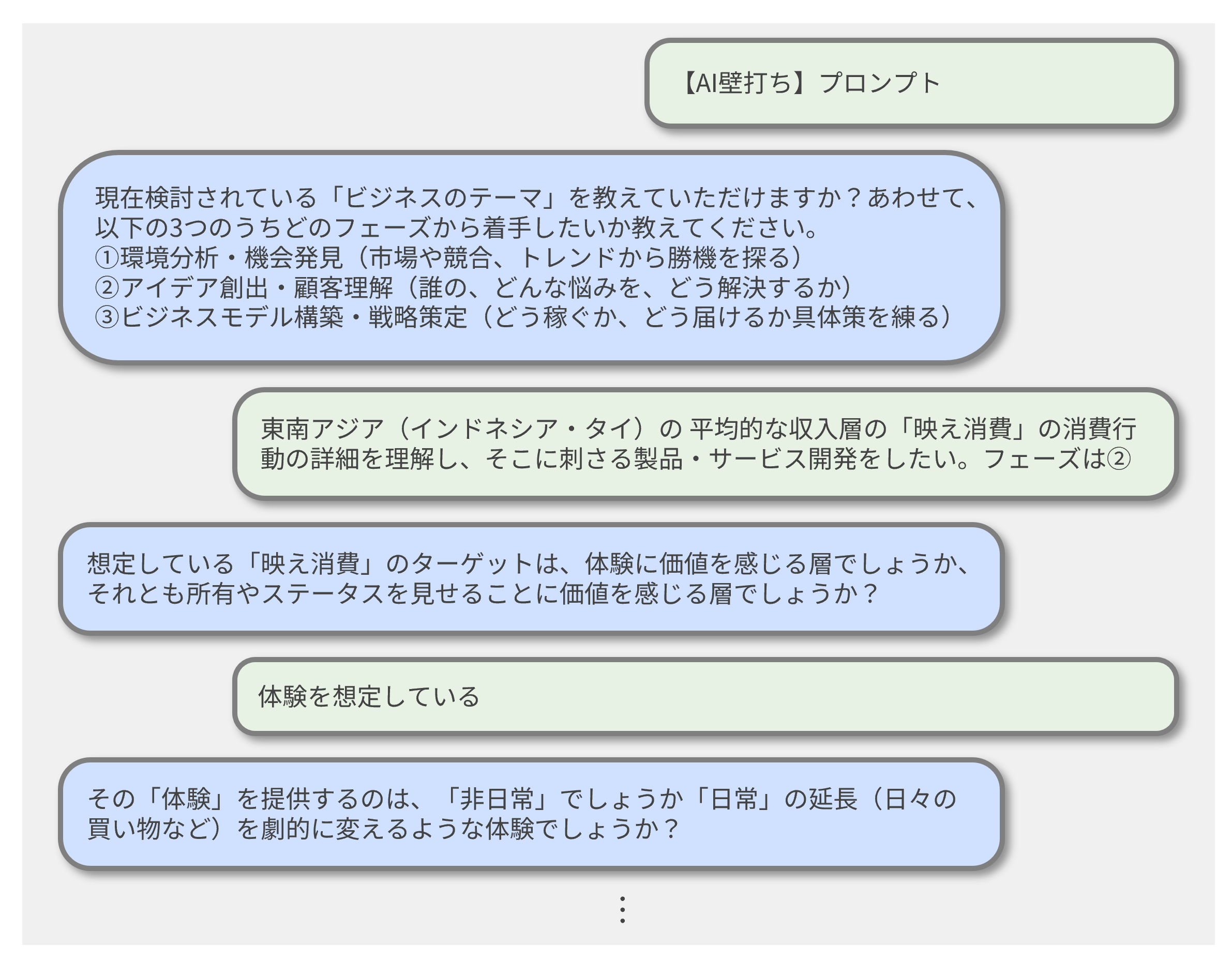 では、ステップ2の「AI壁打ち」の実際の活用場面を、新規事業の検討の例を用いて考えてみよう。