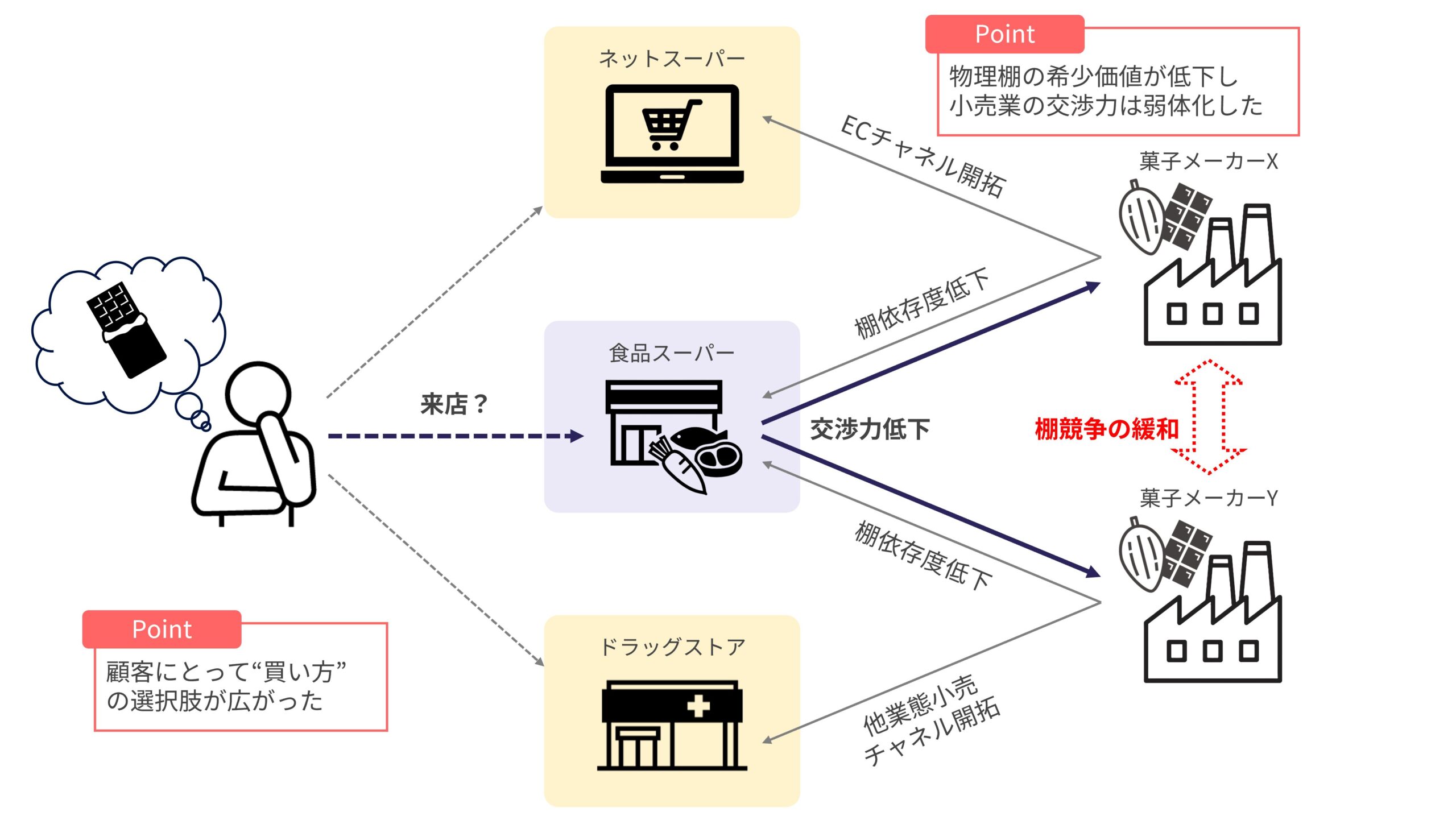 これらの変化はかつて店舗が有していた棚の希少価値を急速に低下させた。ロングテール商品はもとより、売れ筋商品でさえ自社ECやECプラットフォーム、他業態店舗などの代替チャネルに流通し始めた。つまりメーカー/卸にとって棚スペースはもはや参入障壁ではなくなり、小売業が従来のように原価・リベート条件の交渉を有利に進めることは困難となったのだ。
