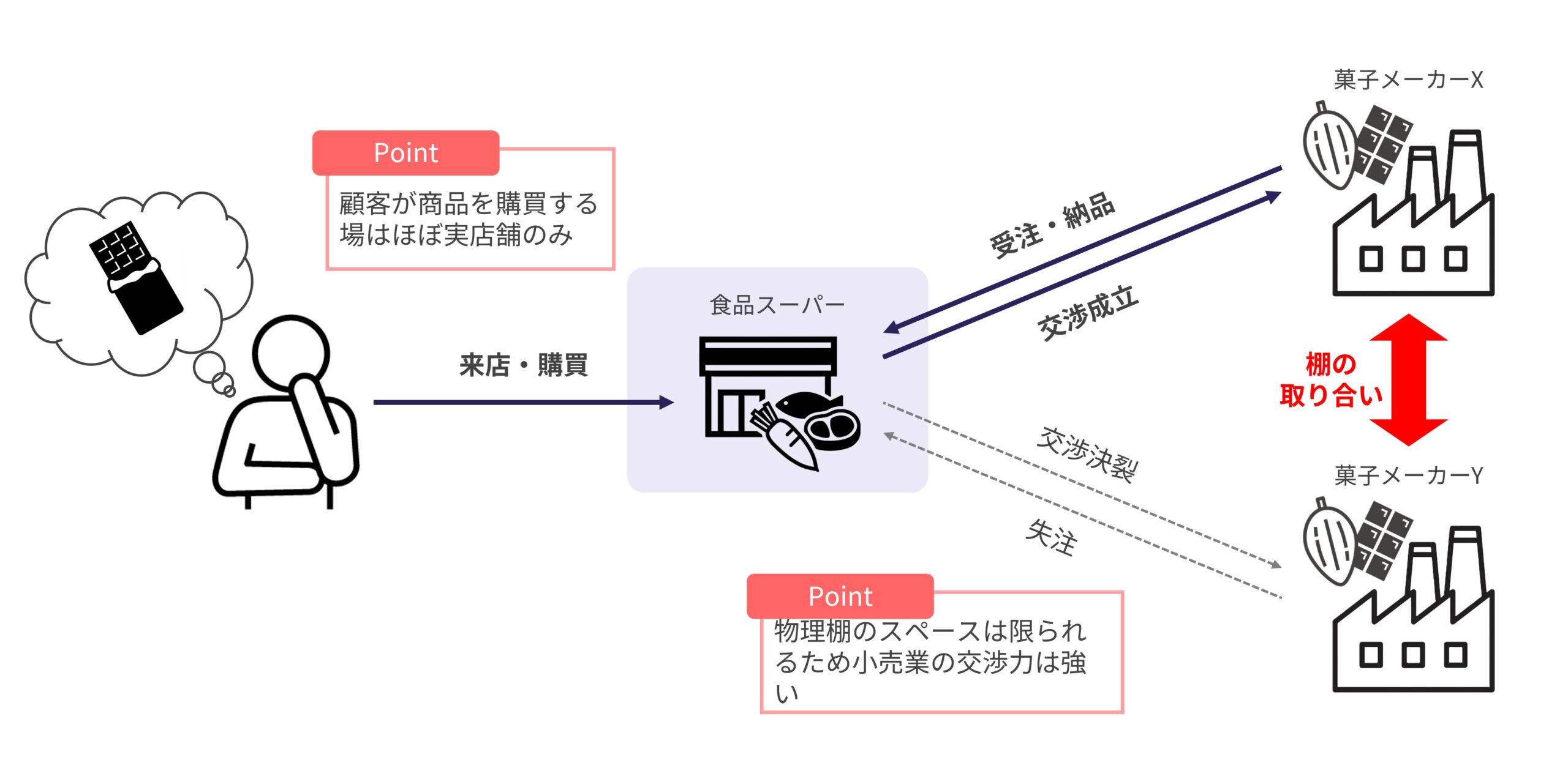 このようなイメージは小売業が業界構造上の優位性を生かして「選択と集中」を実践する中で形成された。ECが存在しない当時、人々が商品を買う場所は小売店舗以外にほぼなかった。これは購買意思決定の大部分が小売店舗の売り場で行われていたことを意味し、店舗の棚はメーカー/卸にとって希少価値の高い資源だった。棚を確保しない限りどんな商品も消費者の目に留まる機会すら得られない。小売業の棚は彼らにとって事実上の「参入障壁」として機能していた。筆者の私見だが、これは2010年ごろまで続いた業界構造であると考えている。