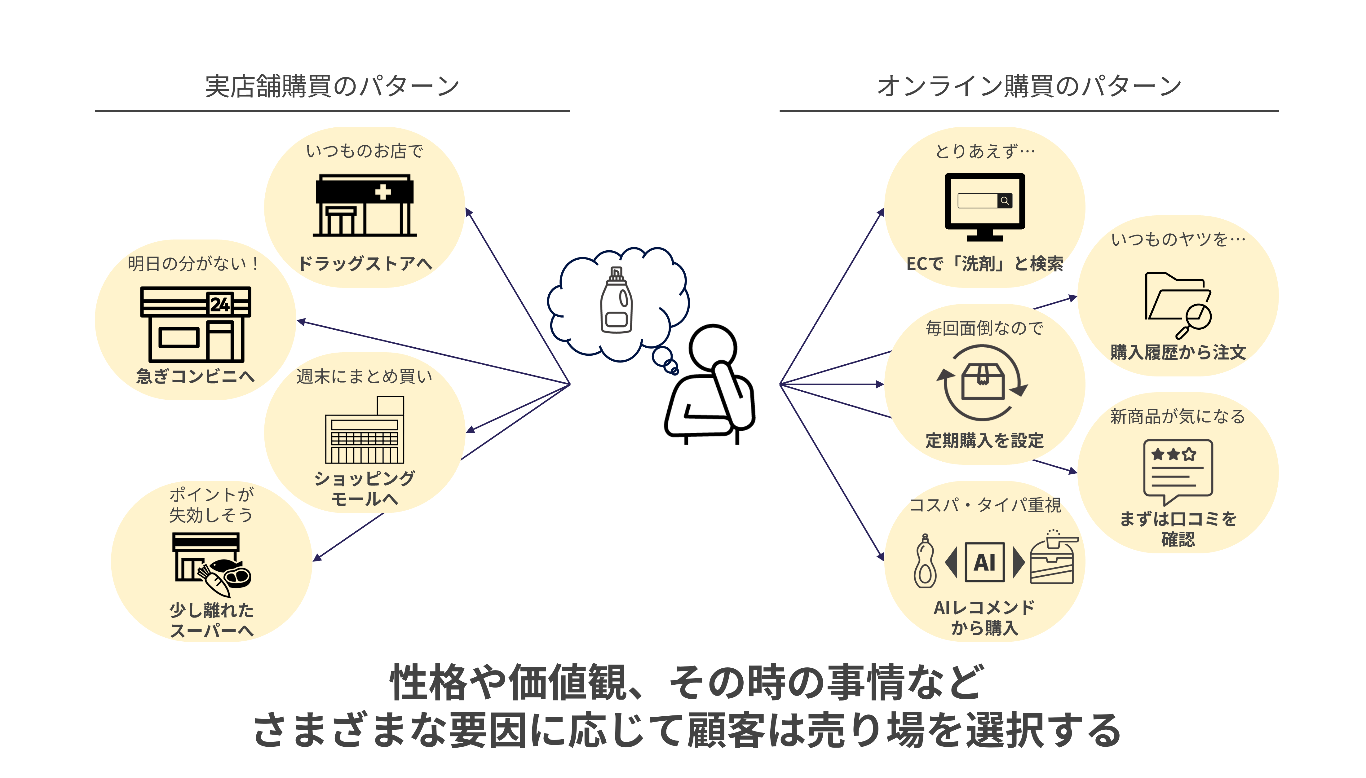 しかし現代の顧客は、「何を買うか」だけでなく「どこで買うか」についても固定的ではない。欲しいものを思いついた瞬間に、EC・店舗・定期購入など複数の選択肢を柔軟に行き来している。例えば洗濯用洗剤の補充が必要な時、以前はとりあえず店舗に行き、商品棚を見ながら複数のブランドを比較した。しかし現代人の購買行動はもっと多様だ。