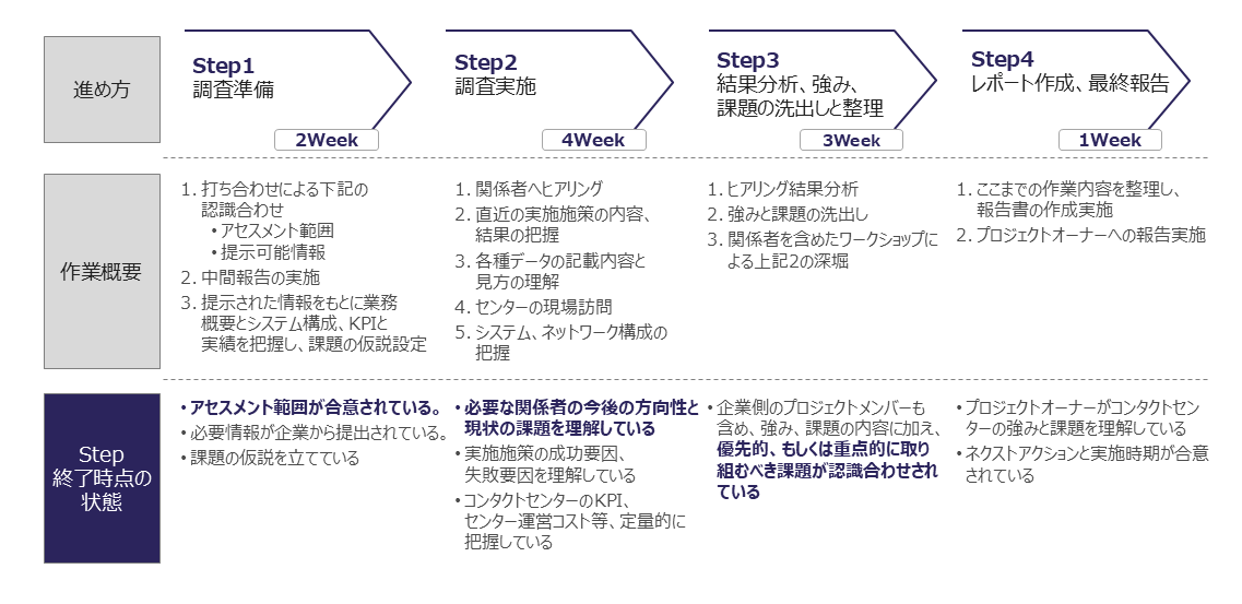 アセスメント実施後のアウトプットは、次フェーズの「コンタクトセンター構想策定」にて検討する「あるべき姿」に対してFit/Gap整理のインプットとなります。