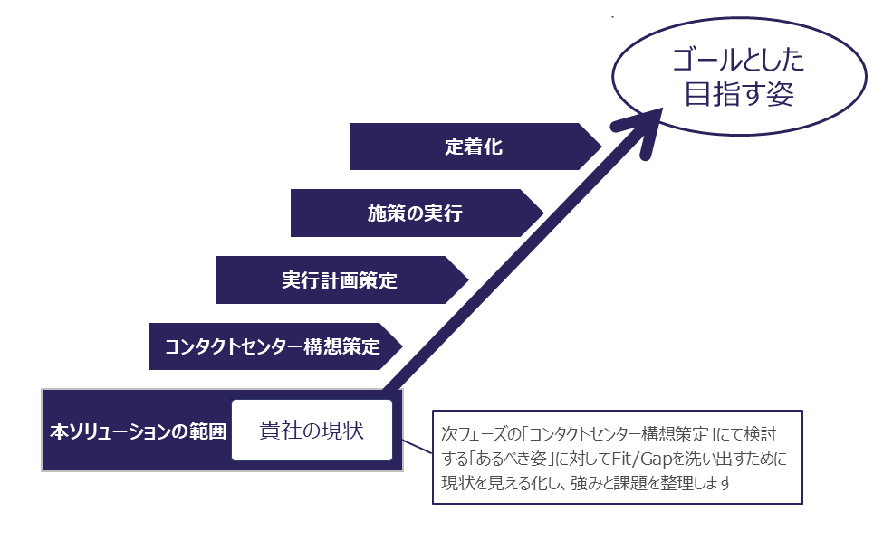 本ソリューションにて、コンタクトセンターの変革を実施するために、フォーティエンス独自のアセスメントフレームワークにて、客観的に貴社コンタクトセンターの現状の見える化とともに、強み、課題を洗い出します。